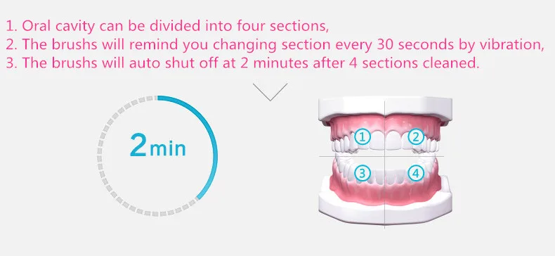 Звуковая зубная щетка может легко удалять пятна и щелки десятками тысяч ударов в минуту, массировать десны, уменьшать кровотечение гумсов, маленькая щеточная головка может легко очистить крошечные коннеры, освежить дыхание.Щетинки будут деформированы после длительного использования, и эффект очистки будет ослаблен, пожалуйста, замените головку зубной щетки каждые три месяца.