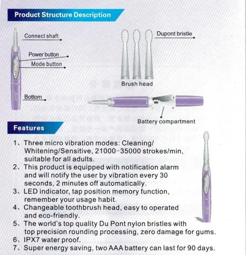 Три режима микро вибрации: Очистка/Отбеливание/чувствительный, 21000-35000 ударов/мин, подходит для всех взрослых.