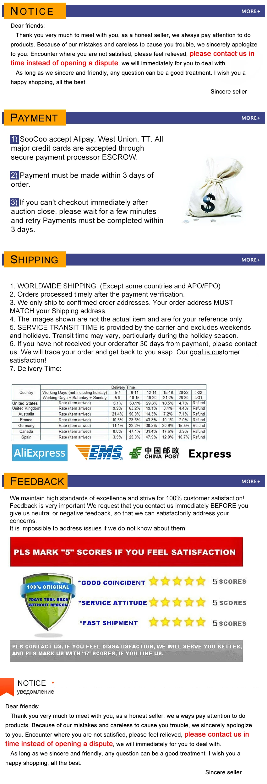 3. После получения поврежденных товаров, погрешность в измерениях, меньшая доставка, доставка, Отправка товара неправильно, не удовлетворены качеством товара, пожалуйста, свяжитесь со мной вовремя, помните, пожалуйста, не стесняйтесь обращаться ко мне, не говоря уже о спорах, Споры только изменят скорость, чтобы решить проблему медленно, не забудьте, пожалуйста, немедленно свяжитесь со мной, я дам вам оплату или замену продукта, даст вам удовлетворительный ответ!