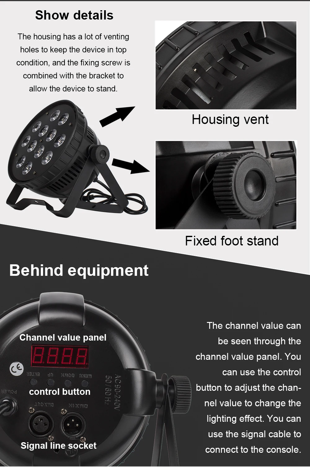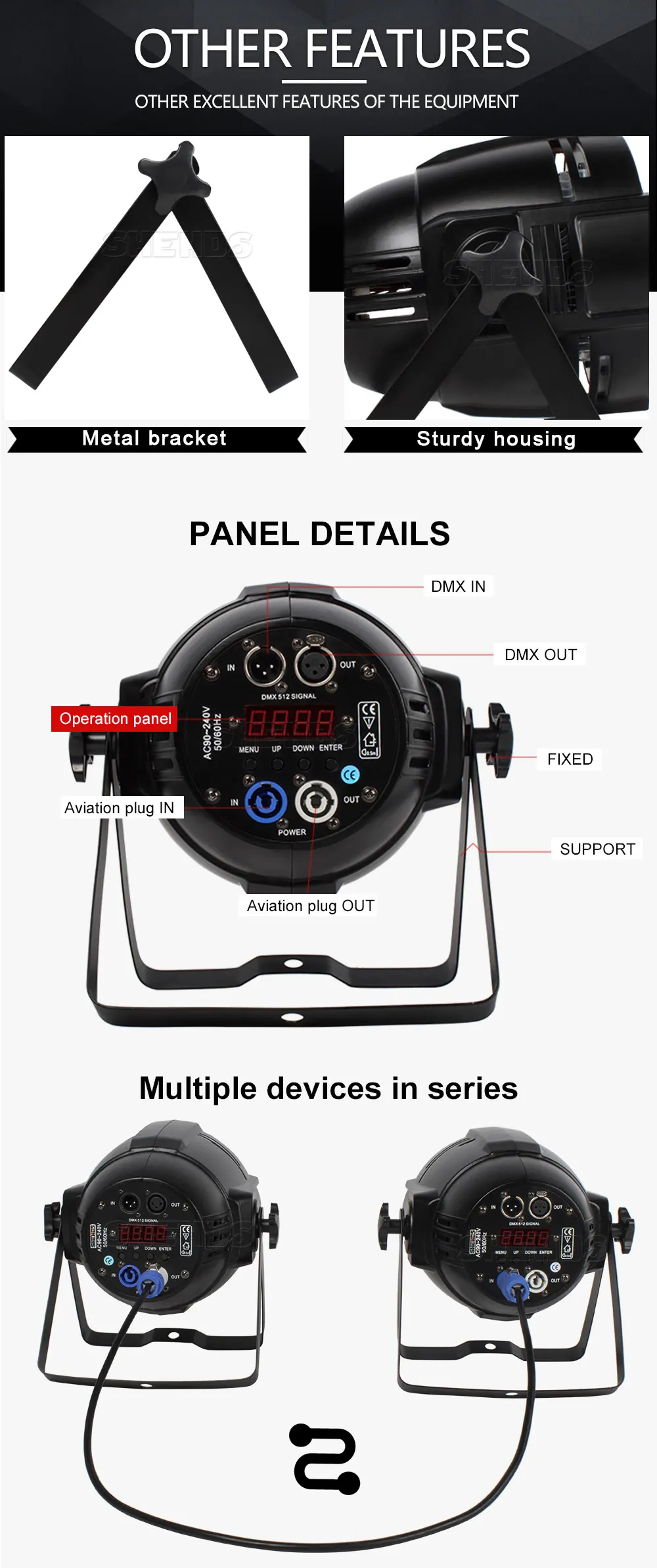 Режимы работы: DMX512, автоматический запуск, звуковое действие, стробоскоп, автономный и мастер/раб, с богатыми передовыми встроенными программами