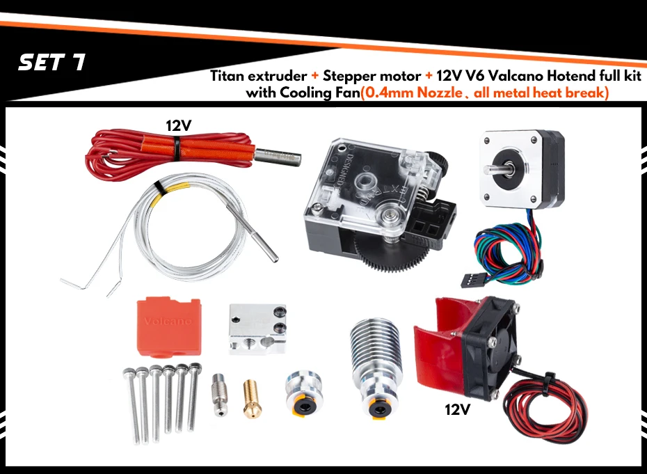 Комплект 7:Титановый экструдер + 23 мм шаговый двигатель +Вулкан 12 ВПолный комплект с охлаждающим вентилятором (0,4 насадка 、 все металлические тепловой перерыв)