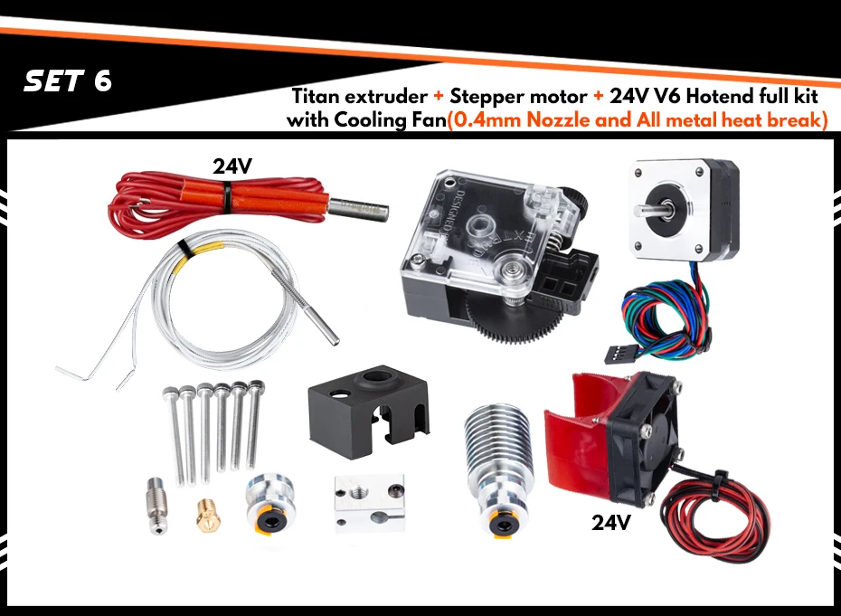 Комплект 2:Титановый экструдер +24 ВV6 Полный комплект с охлаждающим вентилятором (0,4 насадка 、 все металлические тепловой перерыв)
