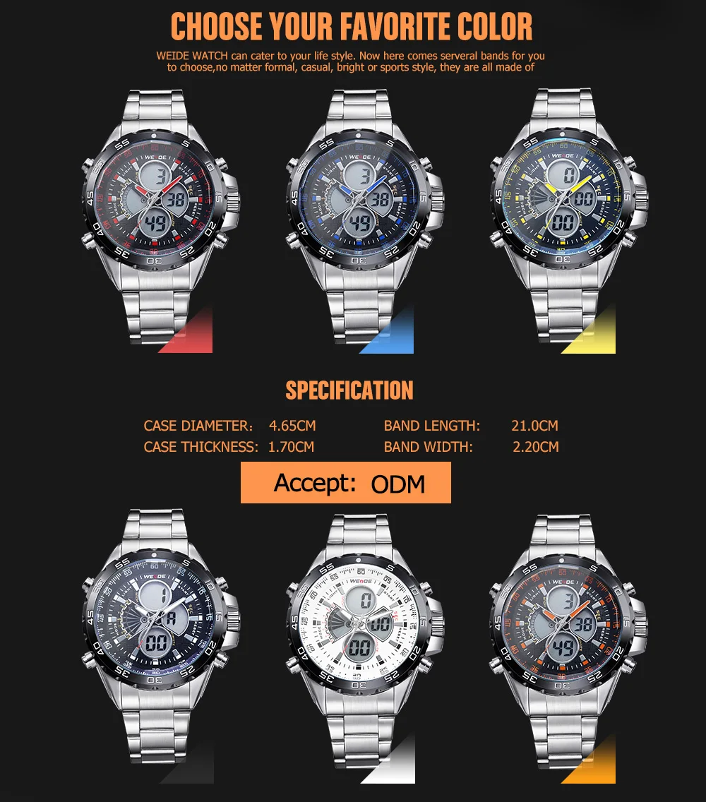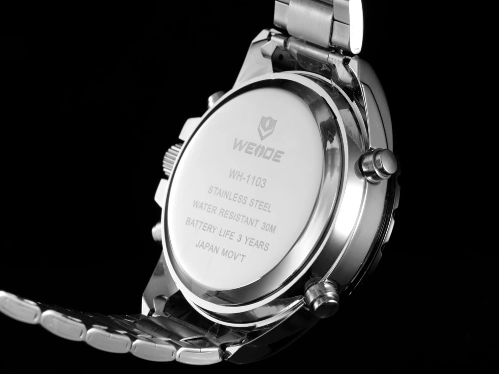 Бренд: WEIDE Артикул: WH1103 Стиль: спортивный, Повседневный, деловой, уличный Дисплей: ANALOG-LCD цифровой Механизм: оригинальный японский кварц + цифровой ЖК-дисплей