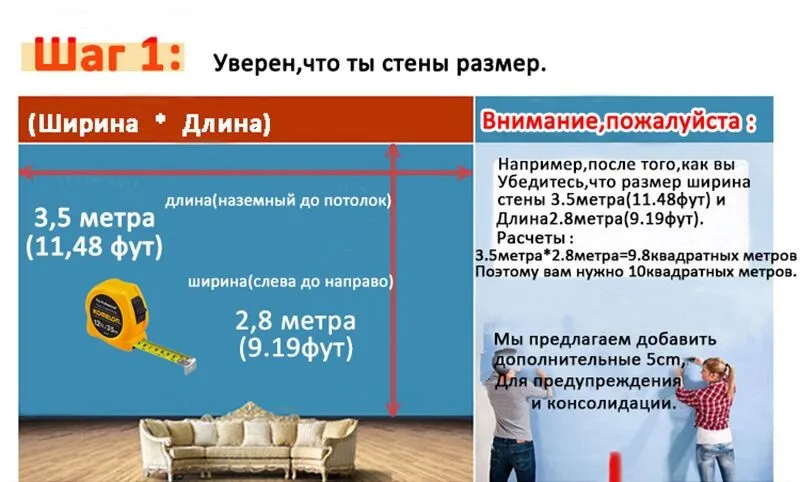 Пример: вам нужно Ширина 225 см Высота 210 см (2,25 м x 2,1 М = 4,7 м2)