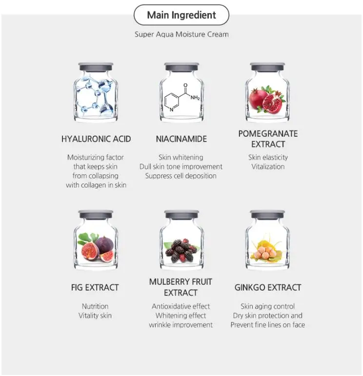 Feature: High Quality moisture cream creates protective layer over skin that is tired from external enviornment and provides moisture. Volume 45ml How to use: In the last step of skin care, take appropriate amount of super aqua moisturizer cream and spread it evenly.