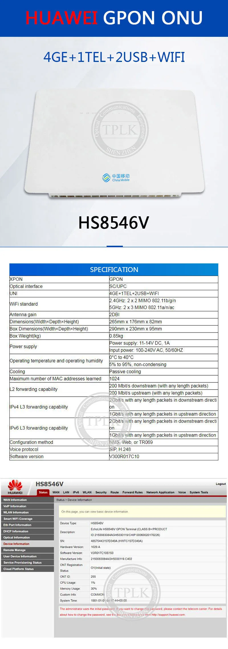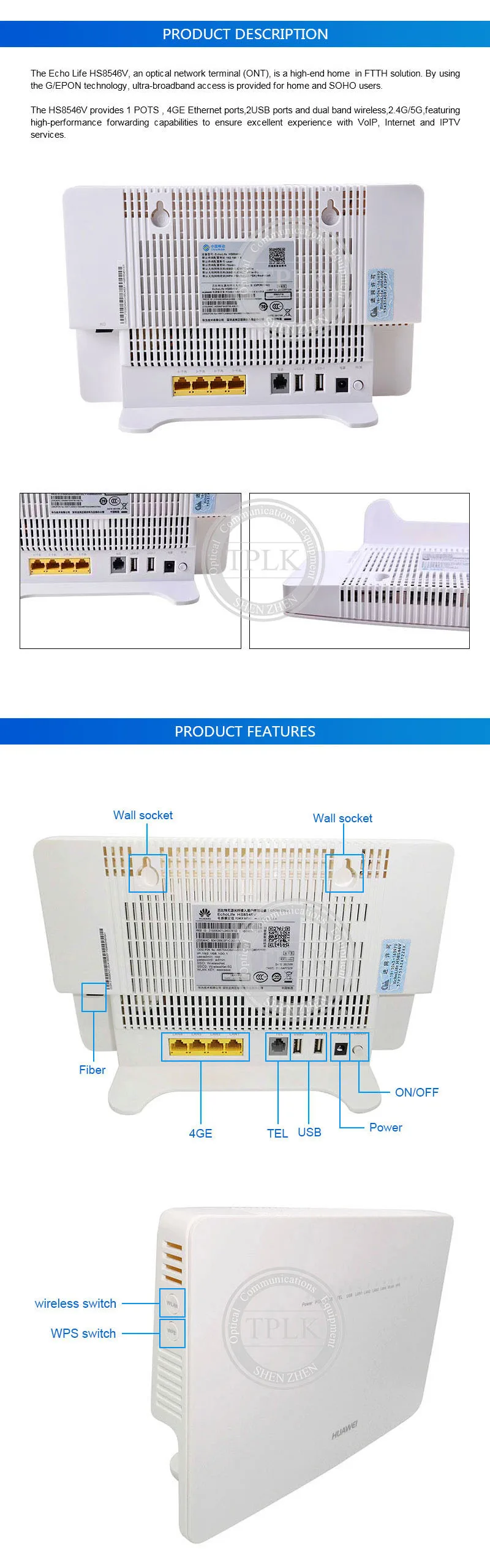 Оригинальный HS8546V маршрутизатор GPON FTTH ONT GPON ONU 4GE + 1TEL + 2USB + WIFI английская прошивка