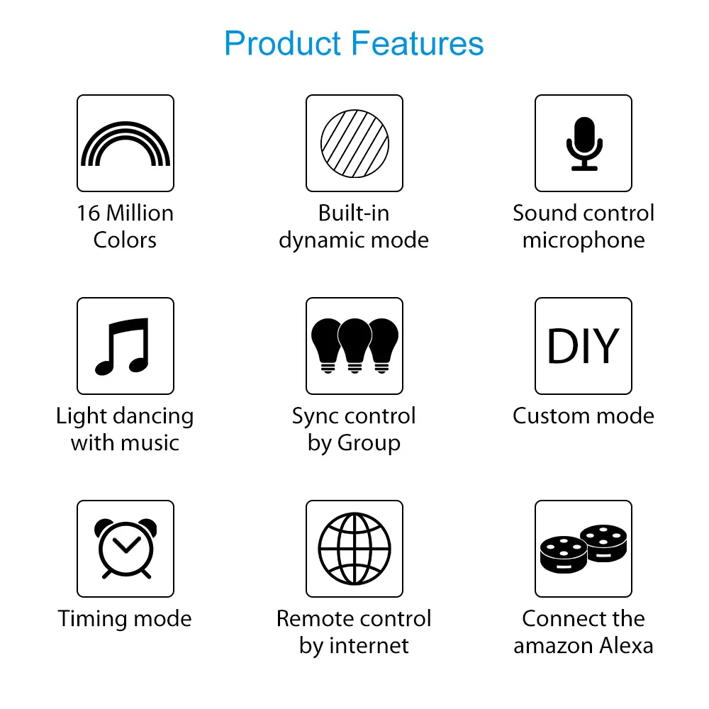 В приложении можно установить до 16 миллионов видов статических цветов и 20 видов динамических режимов; Поддержка функции голосового/музыкального управления в приложении; Используйте камеру телефона, чтобы подобрать светильник; С помощью пульта дистанционного управления смартфона/ИК можно регулировать яркость и скорость; Один телефон может управлять несколькимиWi-FiКонтроллеры(Зависит от настройки маршрутизатора).