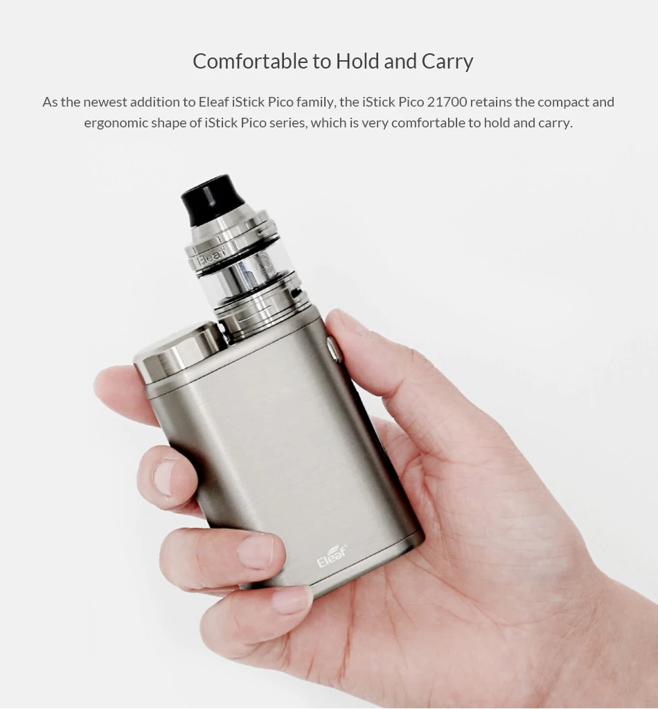 IStick Pico 21700, новейшее дополнение к семейству Eleaf iStick Pico, совместимо с аккумулятором 21700, а также батареей 18650 и обеспечивает аккумулятор AVB 21700 с высоким уровнем заряда для вашего выбора. Он способен работать до 100 Вт и имеет максимум 2А зарядки для эффективной подзарядки. В комплект поставки входит iStick Pico 21700-резервуар ELLO, выдвижной верхний резервуар и выдвижной бак, который представляет новую HW1-C катушке. Благодаря керамической обернутой системе фитиля для сохранения тепла, эта HW1-C катушка может обеспечить отличный и эффективный опыт парения с улучшенным вкусом.