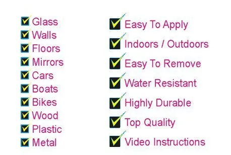 A:Винил и чрезвычайно гибкий материал, который может быть применен для многих гладких, чистых, плоских поверхностей, таких как окрашенный металл, стекло, оргстекло, стекловолокно, пластик, окрашенное дерево, стены, бумага, ноутбуки, зеркала, если вы не уверены, что винил будет работать для вашего выбранного приложения, пожалуйста, напишите нам сначала, чтобы подтвердить.