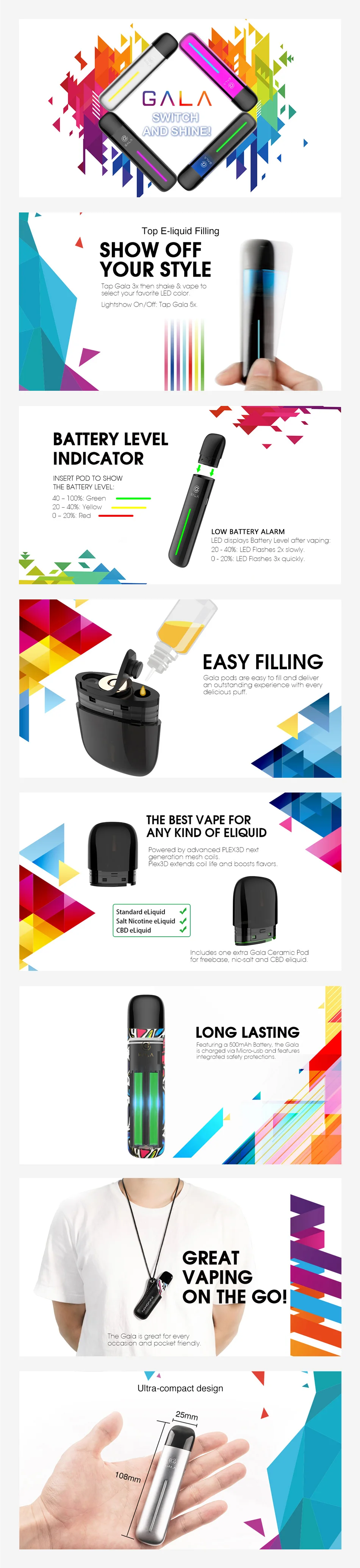 Добро пожаловать в новую серию стартового комплекта,Набор Innokin Gala. Праздничная одежда имеет идеальный размер для вашей упаковки, и она отлично подходит для любого случая. Благодаря яркому СВЕТОДИОДНЫЙ дисплею вы можете три раза встряхнуть, чтобы легко выбрать любимый светодиодный цвет. И три цветовых индикатора четко отображают Срок службы батареи. Набор Innokin Gala не только имеет катушку из орг3d сетки, но и один дополнительный многоразовый керамический поддон. Подходит для nic-salt и C e-liquid, вы получите различный пар. Кроме того, Gala имеет микро-usb и систему защиты безопасности, которая может обеспечить более безопасный опыт курения.