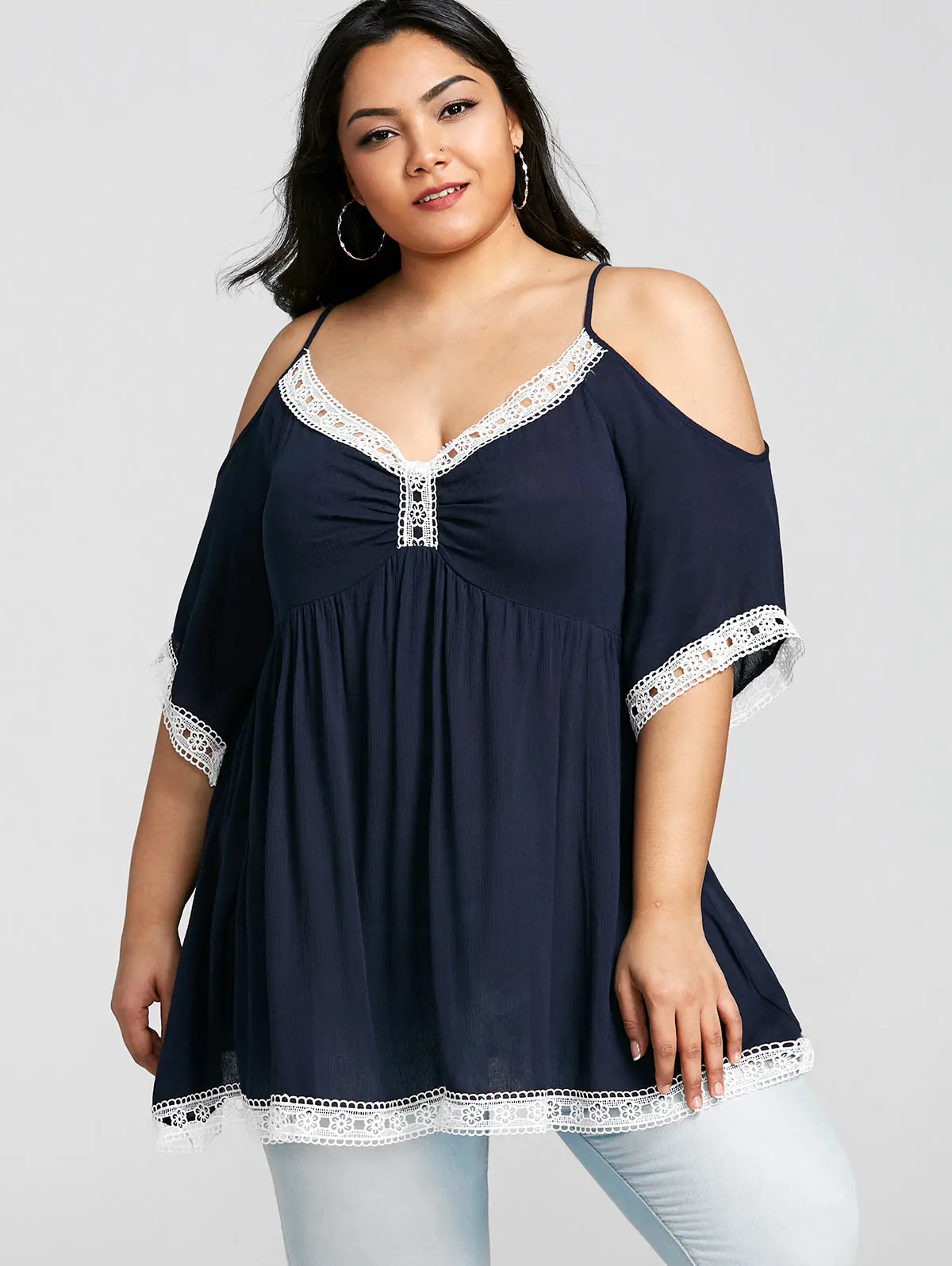 Gamiss плюс размер летняя футболка Babydoll с открытыми плечами кружевные вставки женские Топы повседневные рубашки с коротким рукавом футболки Blusas 5XL