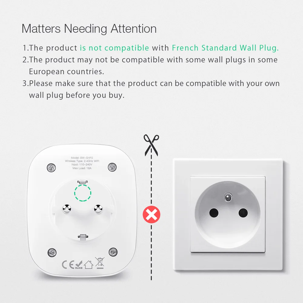 1. Продукт не совместим с французскими стандартными вилками. 2. Продукт может быть несовместим с некоторыми вилками для стен в некоторых европейских странах 3. Пожалуйста, убедитесь, что продукт может быть совместим с вашей собственной вилкой перед покупкой.