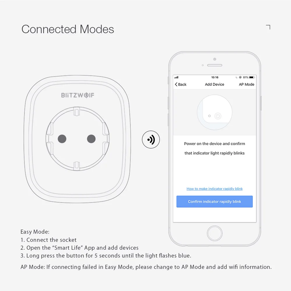 Простой режим: 1. Подключите гнездо 2. Откройте приложение Smart Life и добавьте устройства 3. Удерживайте кнопку в течение 5 секунд, пока светильник не начнет мигать синим цветом. Режим AP: если подключение не удалось в легком режиме, Измените режим AP и добавьте информацию о wifi.