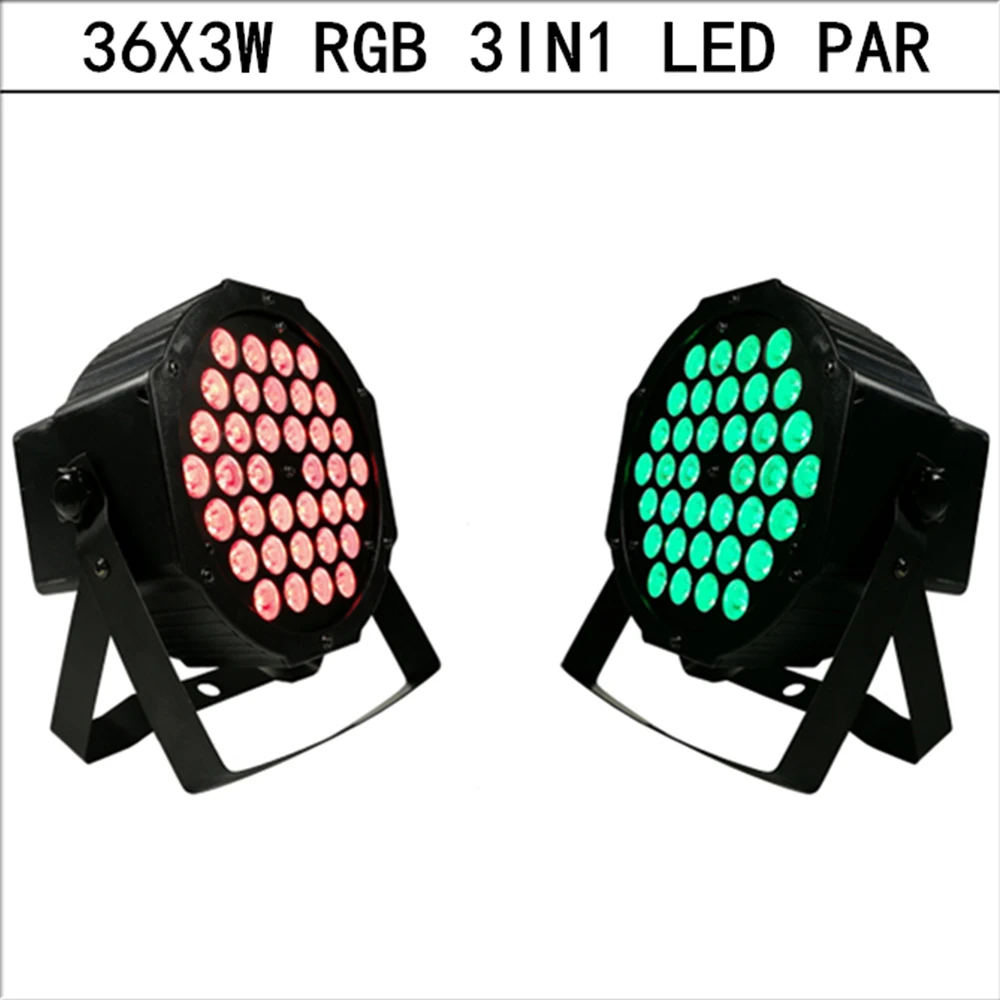 36 X3W RGB 3in1 плоский светодиодный PAR Напряжение: 110V-230 В пер. тока, 50 / 60hz Hzviewing Угол: 25 градусов (45 настраиваемый) светильник Материал: синтетический пластик Характеристики: двойные ручки, могут быть самоподдерживающимися, можно повесить Размеры: 180 × 210 × 100 мм Вес: 1,5 кг Управление: DMX512, управление master-slave, самоходное, голосовое управление