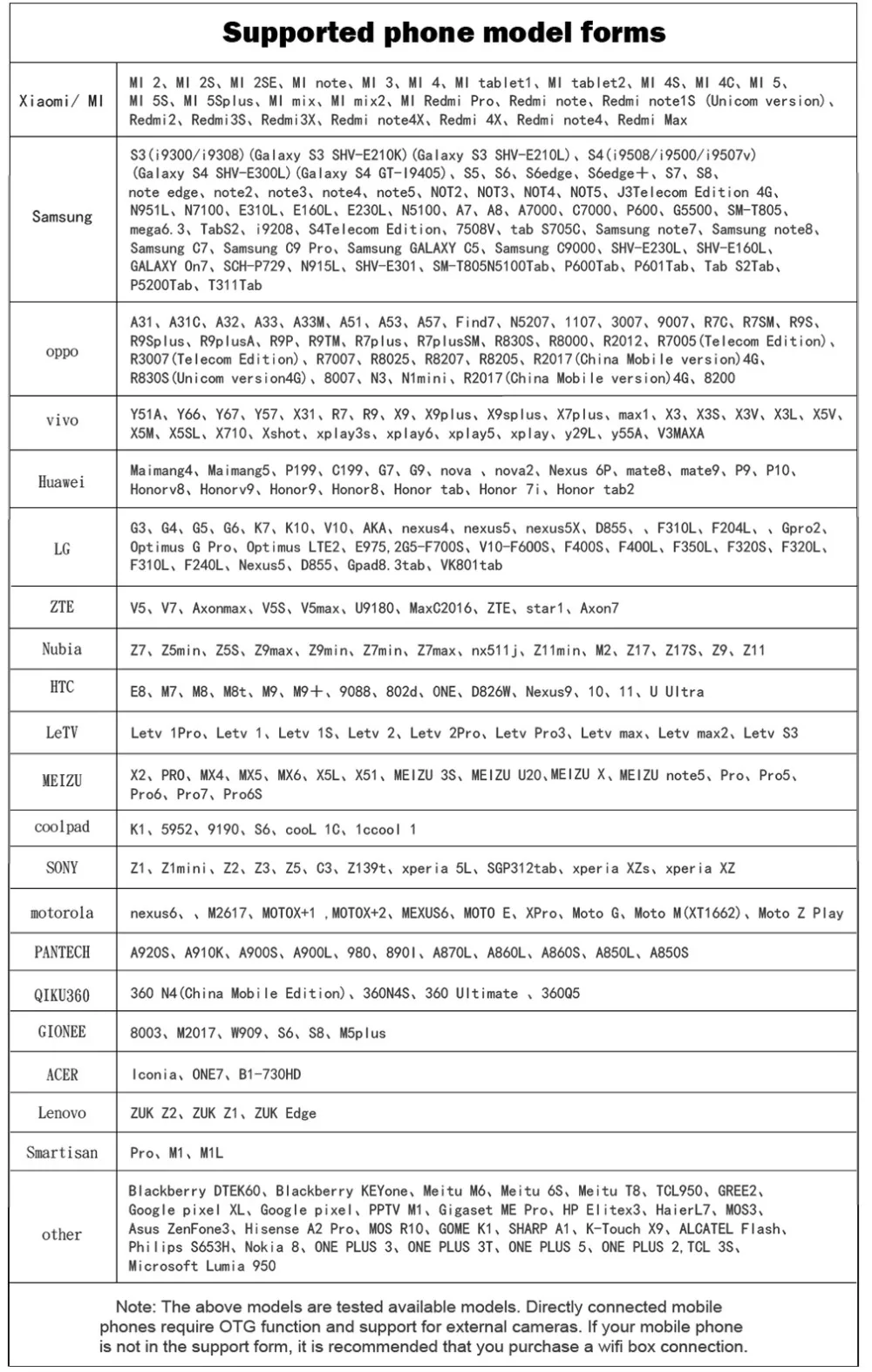 Примечание: у вашего телефона есть функция otg и поддержка внешней камеры, эта камера передает видео на телефоны с помощью uvc-накопителя. Если ваше устройство не поддерживает этот вид камеры, пожалуйста, покупайте с осторожностью. Модели телефонов в следующем списке были протестированы.