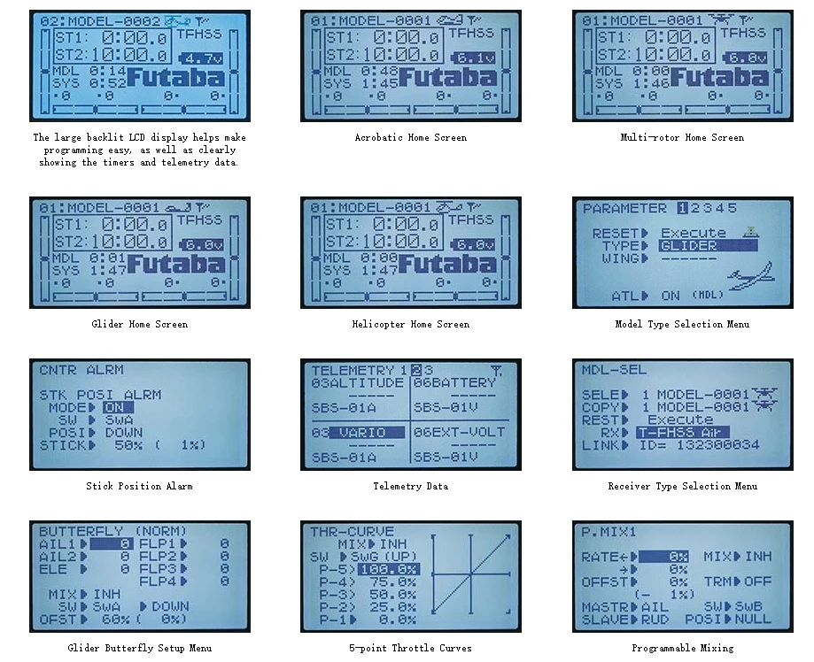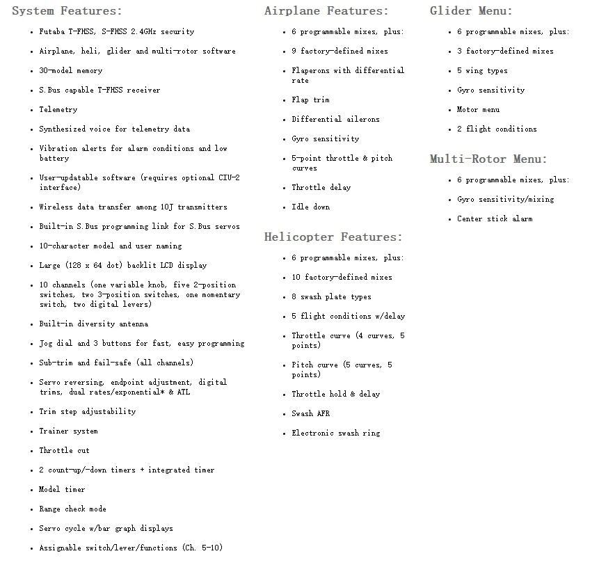 Futaba T10J 2,4 ГГц принимает T-Fhss воздуха стандарт, Поддерживает двустороннюю связь системы, добавляет планер режим и многоосных режим, а также оснащена вибратор и голосовой функцией будильника. Сигнал тревоги низкого напряжения даст вибрацию.