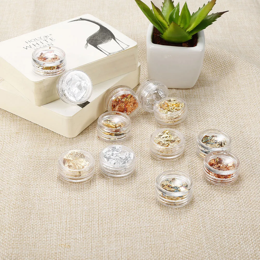 100% Brand-new and high quality.12 pots nail art foil, with golden, sliver & copper colors in defferent shape and sizeTo apply either embed into acylic or gel or use on top of the nail adhering them to tacky nail polish and finishing with a top coat