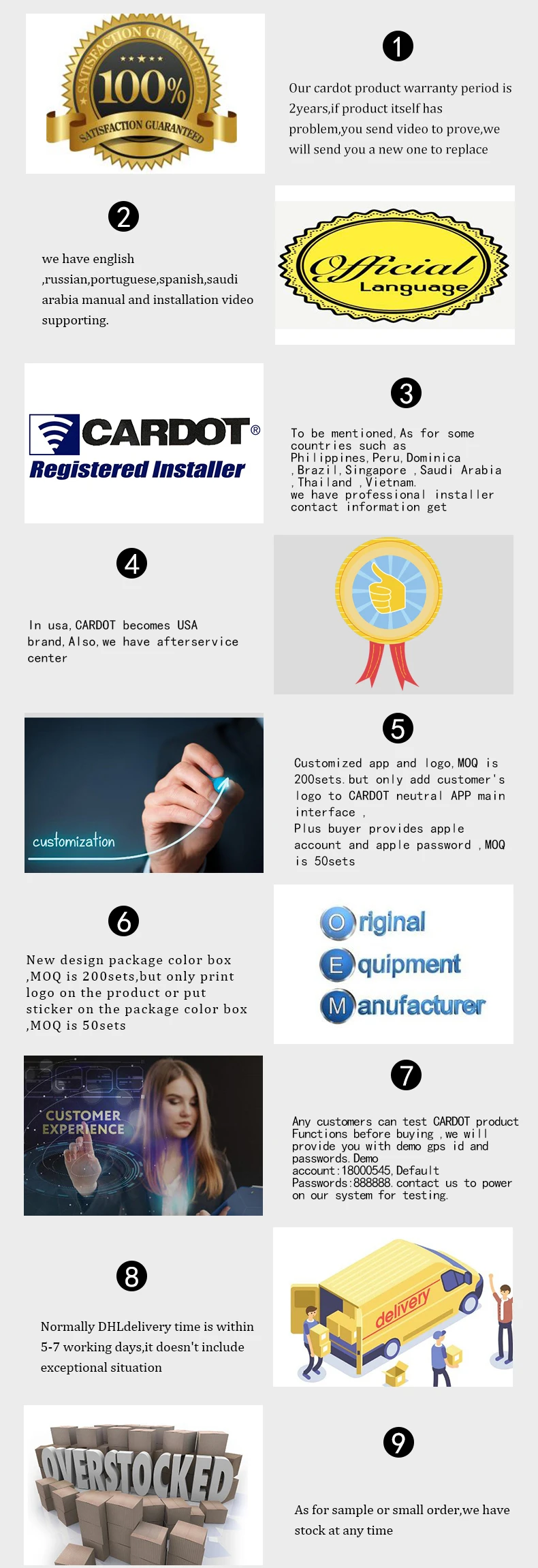 Если вы выбираете Стандартный сервис aliexpress, обычно время доставки составляет 60-120 дней, иногда это быстро, иногда это медленно, пожалуйста, терпеливо подождите, вы получите груз, если происходит возврат груза без прохождения авиационной безопасности, пожалуйста, не беспокойтесь, я повторно отправлю груз после того, как Вы согласны или вернем вам деньги. Или вы добавите стоимость доставки, чтобы отправить груз снова Экспресс-доставкой.Мы не оспариваем логистические споры в течение 90 дней, если вы не восстановили продукт, вы можете открыть логистические споры, вернем вам деньги. ВниманиеУважаемые клиенты, когда вы получаете груз, если вы удовлетворены нашим продуктом, мы ценим вас, чтобы дать нам 5 начать обратную связь. Если вы не удовлетворены нашим товаром или вам нужна помощь или у вас есть какие-либо вопросы о нашем товаре, пожалуйста, свяжитесь с нами, мы поможем вам решить проблему и сделаем все возможное, чтобы Вы остались довольны. Мы приветствуем клиентов высокого качества, мы также являемся продавцом высокого качества. Пожалуйста, не открывайте спор и не оставляйте плохой отзыв без какого-либо общения с нами, взаимное отношение.Cardot Лидер продаж