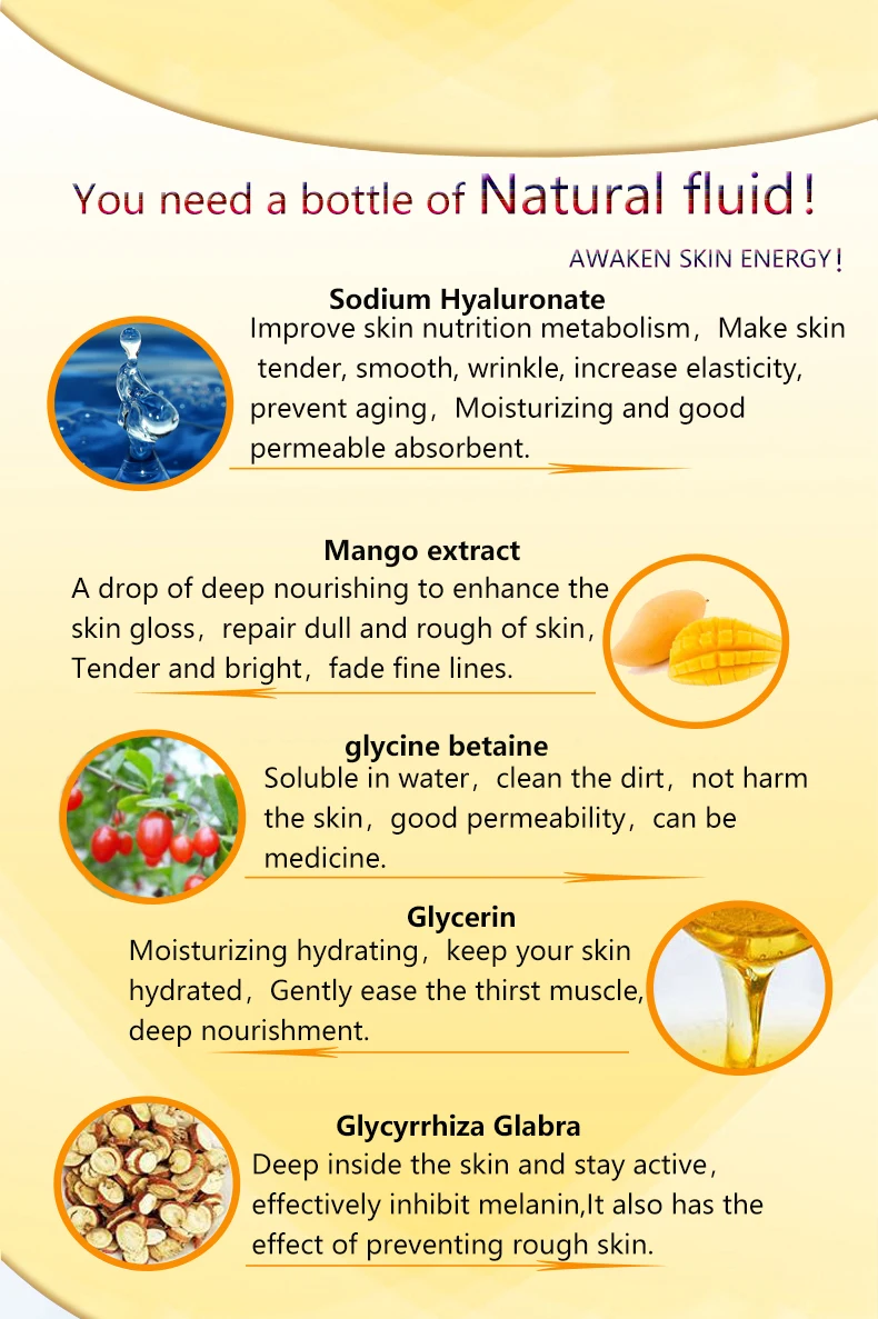 Эссенция манго питательная интеграция экстракта glglabra, немного за бит глубоко питает, улучшает блеск кожи, улучшает тусклую грубую кожу, деликатный яркий, опреснение тонких линий, а также гиалуроновая кислота, глубокое увлажнение, кожа, полная упругости, естественная яркая и гладкая.