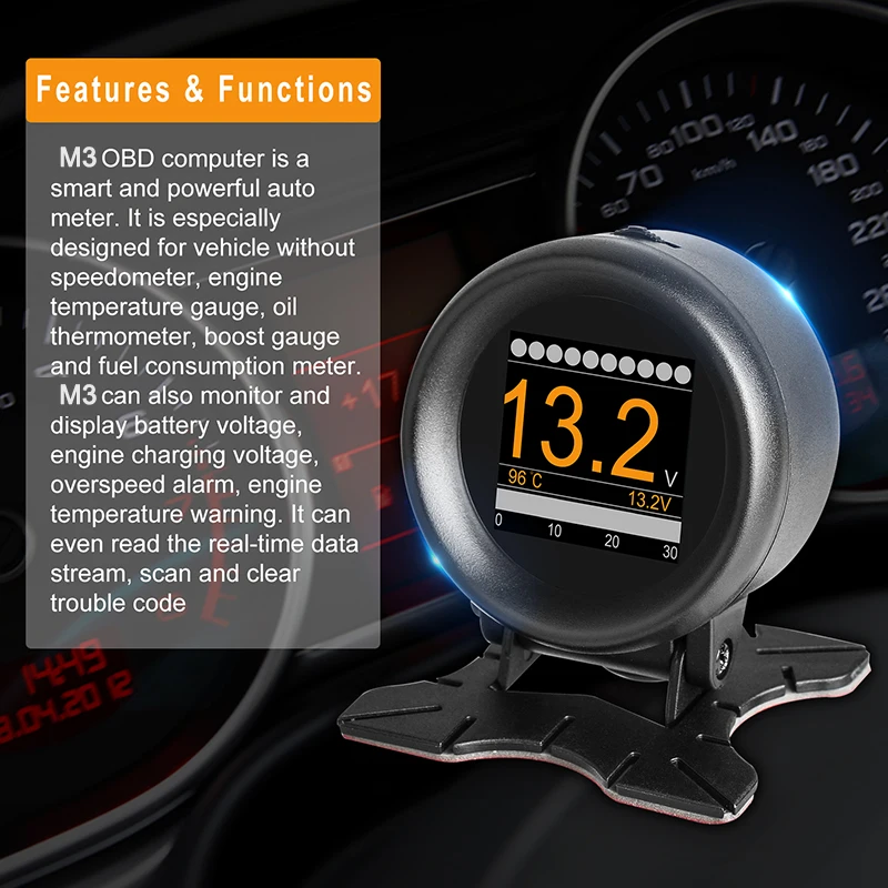 M3-это многофункциональный измеритель OBD2, с умным и модным дизайном. Это просты в установке. Порт OBD помогает использовать его после подключения. Нет необходимости разрушать провод. Поставляется с креплением и двусторонней лентой, которая надежно фиксируется на платформе.
