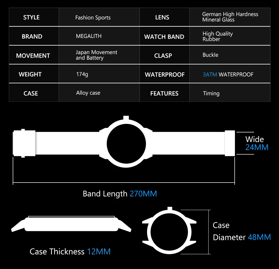 Бренд: мегалитическая Стиль спортивный, Повседневный, деловой, модный Дисплей: Аналоговый Механизм: оригинальный японский кварцевый механизм Основные функции -100% Новинка с биркой и высоким качеством -3 АТМ/30 М Водонепроницаемость (поддержка холодного душа и плавания, не использовать часы под водой, не поддерживать горячую воду); -Корпус из качественного сплава; -Набор ножей из нержавеющей стали Спецификация (приблизительно) -Диаметр корпуса: 4,8 см -Толщина корпуса: 1,2 см -Ширина ремешка: 2,4 см -Общая длина: 27 см -Вес изделия: 175 г (без учета веса упаковки) Посылка включает в себя -1 х часы MEGALITH -1 х Оригинальный Подарочный бархатный мешок -1 х Салфетка -1 х Руководство пользователя