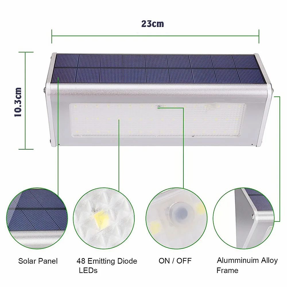 Параметры: Наименование товара: 48LED солнечный светильник Цвет: серебро Материал: Алюминий из алюминиевого сплава Излучаемый Цвет: белый светильник Солнечная панель: 5,0 V 3,2 W Светодиодный Спецификация: 30lm SMD2835 6000k Максимальное значение люмена: 1000 лм Угол обнаружения: 180 градусов Батарея: литий-железо фосфат батарея 3,2 V 4500mAh Рабочий ток: 1800mA Количество светодиодов: 48 шт. Время зарядки: 8 часов на солнце Расстояние обнаружения: 5-8 метров Водонепроницаемый Рейтинг: IP65 Время индукции: более 500 раз (при полной зарядке, 15 с каждый раз) Если светильник с Индукционным режимом задержка времени не закончена, индукция снова начнется. Упаковка включает в себя: 1 х Солнечный светодиодный светильник 1 x пробивая линейка 2 x винта для установки с якорем Руководство пользователя-1 шт.;