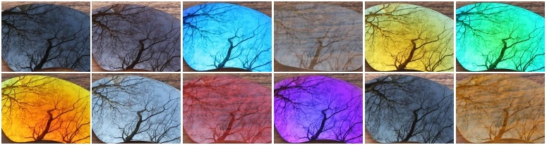 Цвет линз: черный, коричневый, красный зеркальный, металлический серебристый, золотой зеркальный, зеленый зеркальный, фиолетовый зеркальный, персиковый Золотой, Полуночное солнце, прозрачный, прозрачный желтый, фотохромный прозрачный и фотохромный серый