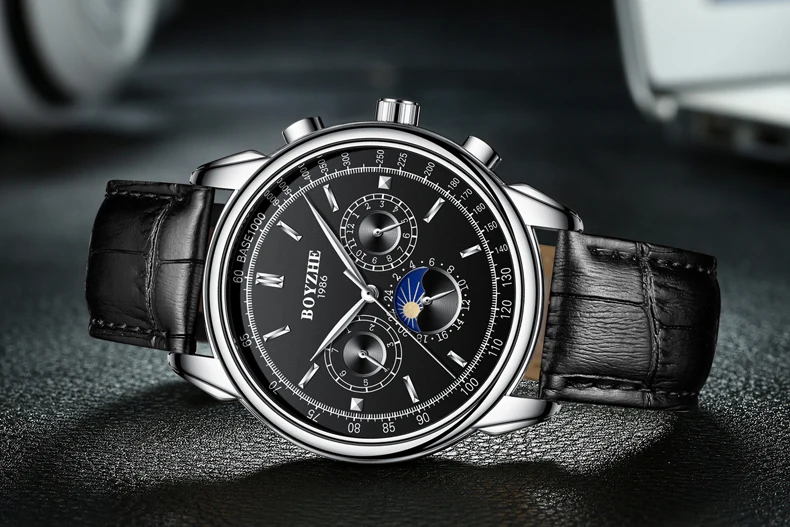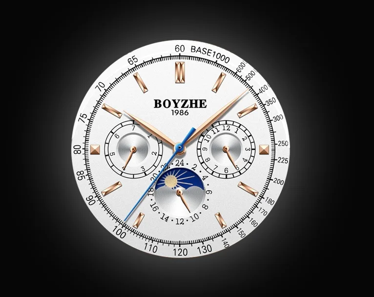 Бренд: BOYZHE Механизм: полностью автоматическая техника Зеркало: закаленное стекло с синей пленкой Ремешок: высокого качества кожа Функция: время, дата, месяц, фаза Луны Водонепроницаемый: Водонепроницаемый Диаметр циферблата: 42 мм Толщина циферблата: 15 мм Ширина ремешка: 22 мм Размеры измеряются вручную, так как в способе измерения могут быть ошибки.