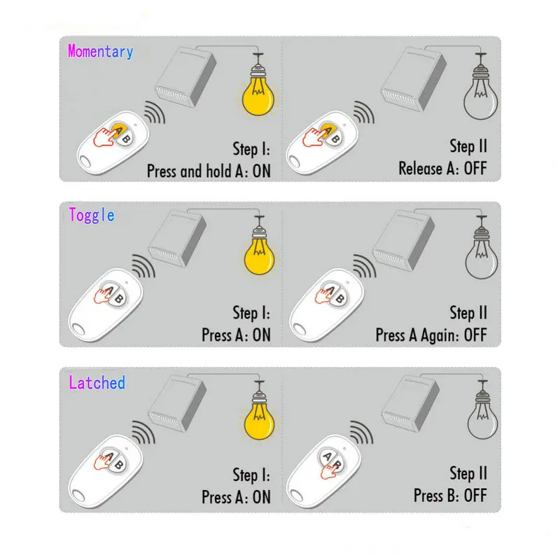 9. Body volume: 92mm*40mm*15mmAbout transmitter distanceDue to the refraction and reflection in the process of radio signal transmission will form some dead and unstable areas, the transmission distance of wireless remote control switch will be different in different receiving and receiving environments. The main factors affecting the transmitting distance are: whether the transmitter end power is sufficient, the height of the transmitter to the ground, the direction of the antenna, whether there are obstacles in the middle, weather conditions, whether there is the same frequency interference, whether there are interference electrical appliances around, the sensitivity of the receiver, installation position and so on! So the actual distance is subject to practice! Please pay attention to this before you buy, so as not to cause unnecessary trouble!Four: work mode selectionThere are four working modes of the 8-way: signal self-locking, signal interlocking, signal non-locking, signal self-locking and non-locking1. Signal self-locking -- press the No. 1 key of transmitter to learn2. Signal is not locked -- press the No.2 key of transmitter to learn3. Signal interlock -- press transmitter No. 4 to learn4. Signal 1~6 channels self-locking and 7~12 channels non-locking coexist -- press No. 8 key of transmitter to learnDescription of self-locking/Non-locking/interlocking1. Signal self-lockingPress the No. 1 button of the transmitter, and the relay corresponding to the No. 1 button is absorbed and maintained, and then press the No. 1 button, the No. 1 relay is disconnected; Press No. 2 key of transmitter, No. 2 key corresponding to relay suction and merge hold, then press No. 2 key, No. 2 relay disconnected; 3~8 keys work according to this cycle.2. The signal is not lockedPress and hold the No. 1 key of the transmitter, and the relay corresponding to the No. 1 key will close, and the relay will disconnect after letting go. Press No. 2 key, and the relay corresponding to the No. 2 key will close, and disconnect after letting go. 3~8 keys work according to this cycle.3. Signal interlock: press No. 4 key of transmitterPress the No. 1 button of the transmitter, the corresponding No. 1 relay absorbs and merges to keep, press the No. 2 button, the No. 1 relay disconnects, and the corresponding No. 2 key absorbs and merges to keep; 3~8 keys work according to this cycle.Note: If you want to change the receiver to other functions after learning well, please first clear the receiver code and then select the required button to learn the code again.Five: Add or remove the emitter method1. Learning methodsWhen the receiver is powered on, press the learning button on the receiver, and then let go and enter the learning state; Press a key of the transmitter to learn according to the function you need. If the receiver receives the signal and the indicator blinks for about 1 time (the buzzer rings once), the learning is successful.2. Clearing methodWhen the receiver is powered on, long press the learning button on the receiver for about 8 seconds until the indicator is off (the buzzer will ring for about 3 seconds), indicating that the code has been cleared successfully.Six: Package including
