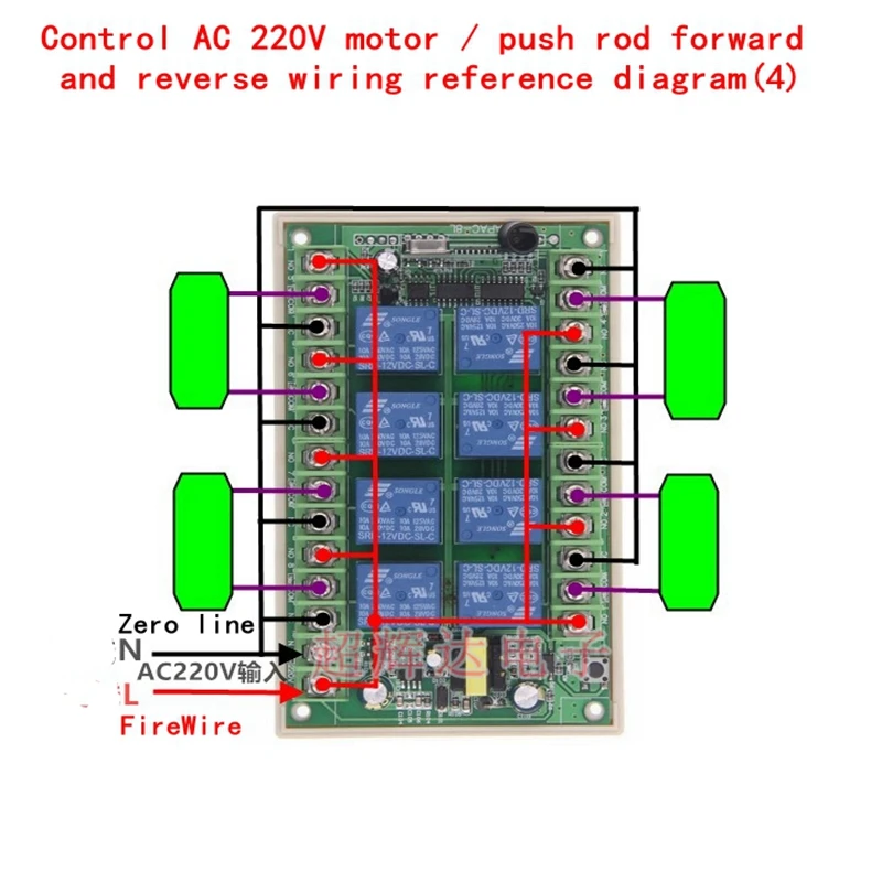 One: Product overviewThank you for purchasing the 8-way wireless intelligent receiving controller designed and manufactured by our company. It outputs switching signal for 8 relays and has working indicator light, which can make the equipment to be controlled reach the positive and reverse of the motor; Or switch on, off conversion and various special control program requirements. Mainly used in electric doors, Windows, lifting equipment, gate, elevator, industrial control and security industries.Two: product wiring reference diagram![]()