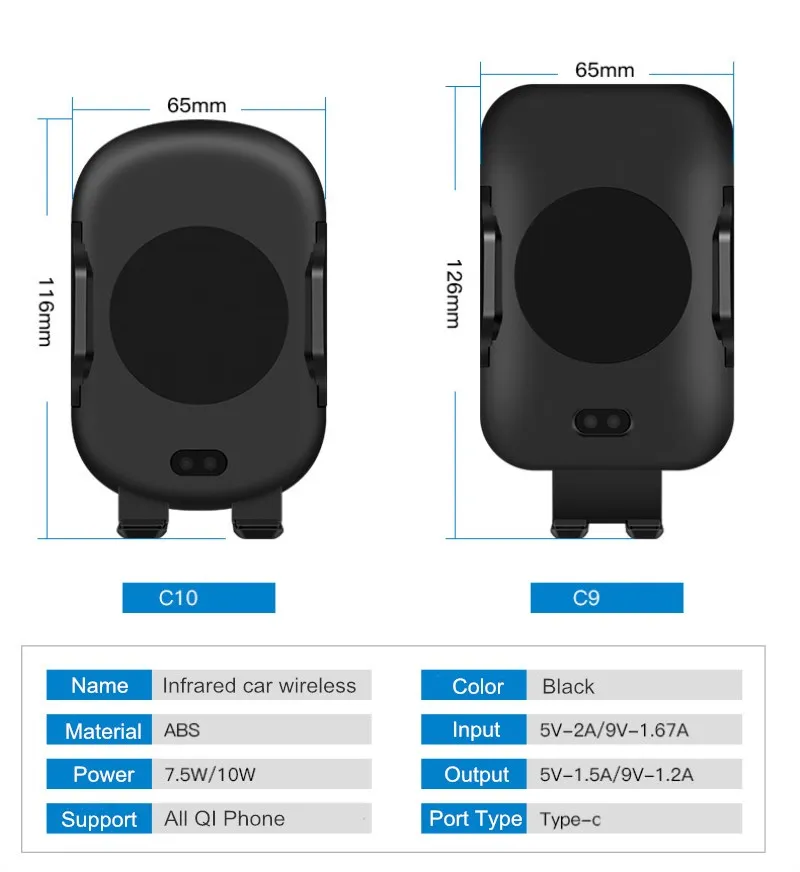 Управление одной рукой: полностью автоматизированное беспроводное автомобильное зарядное устройство с встроенным передовым инфракрасным датчиком. Два зажима автоматически открываются и захватывают телефон, когда вы поместите телефон близко к держателю. Простота в использовании и безопасное вождение. 2 в 1 Функция: сочетает Беспроводное зарядное устройство и держатель телефона в одном устройстве. Беспроводная зарядная панель обеспечивает быструю зарядку во время вождения. Сохраните вас от запутанных связывающих шнуров или кабелей, процесс подключения кабеля в и из устройства. Два варианта установки: крепление на вентиляционное отверстие и установка на присоске, использует телескопическую руку, чтобы обеспечить более близкий обзор устройства, вы можете отрегулировать держатель, чтобы держать телефон под идеальным углом обзора во время вождения. Совместимые устройства: Инфракрасная Беспроводная зарядка для Samsung Galaxy S9/S9 plus, S8/S8 plus, S7/S7 Edge, Note 8, iPhone X, iPhonx 8/8 Plus и другие устройства с поддержкой Qi; поддержка быстрой зарядки, но необходимо использовать адаптер быстрой зарядки QC2.0 3,0 для быстрой беспроводной зарядки; мобильные телефоны без функции беспроводной зарядки требуют дополнительных беспроводных приемников Поддержка быстрой беспроводной зарядки Samsung 10 W и iPhone 7,5 W.