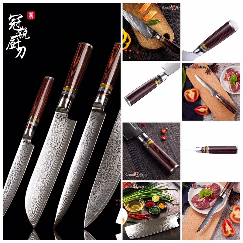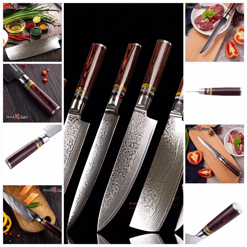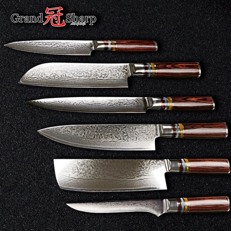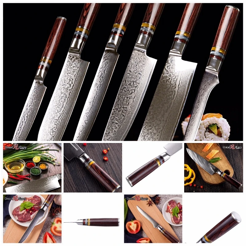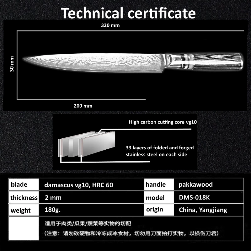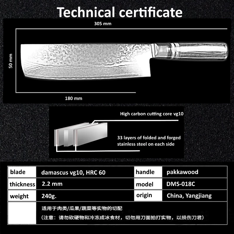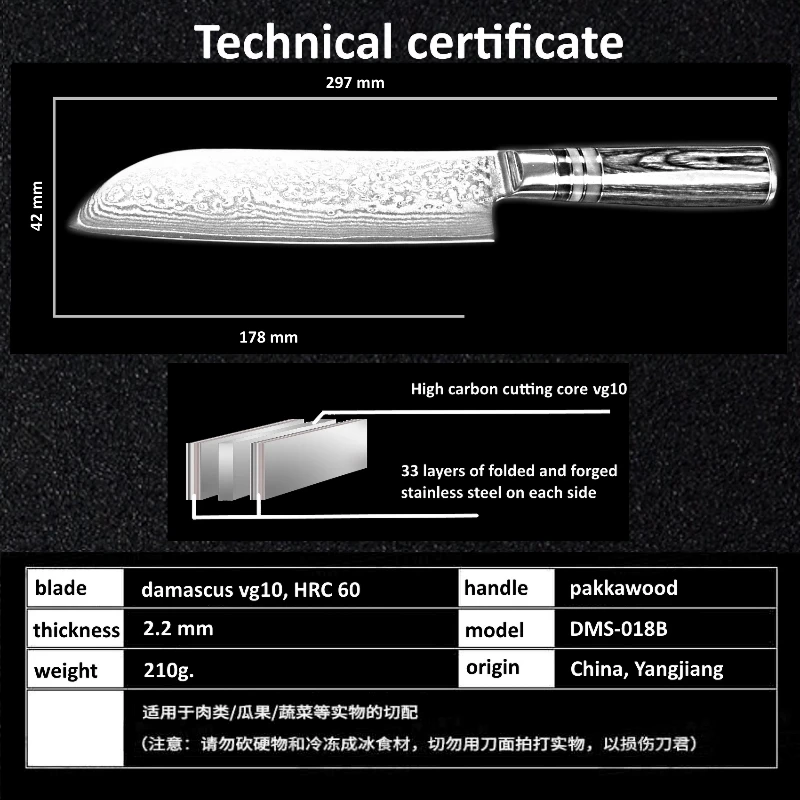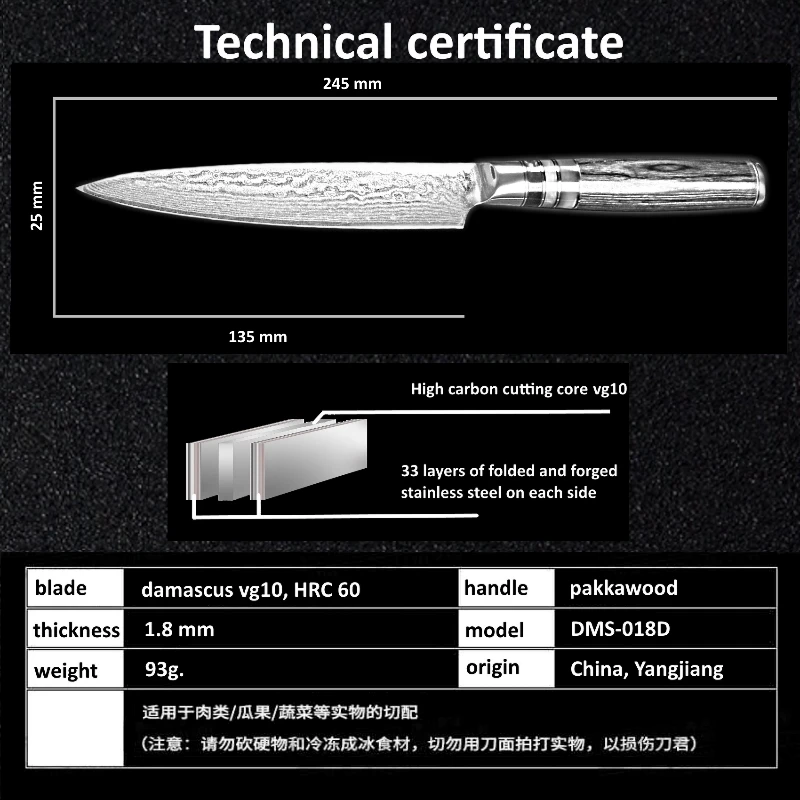 Лезвие:67 слоев дамасской стали импортированы из Японии. VG-10 Сталь резки core; 33-слой Нержавеющая сталь SUS430 и SUS431 на каждой стороне.