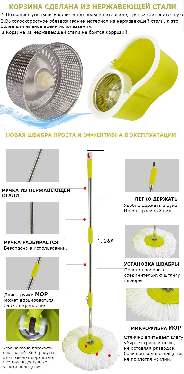 - Влажной и сухой уборки помещения - Борьбы с пылью - Ухода за мебелью - Мытья окон - Мытья автомобиля Spin and Go любая уборка превратиться в настоящее удовольствие. Это приспособление в настоящее время пользуется огромной популярностью у всех современных хозяек, которые хотят, чтобы их дом всегда сиял чистотой, но при этом не желают тратить на процесс уборки много времени и своей энергии. Комплектация 1. Ведро 2. Швабра 3. Вращающаяся на 360 градусов насадка - 2 штуки.