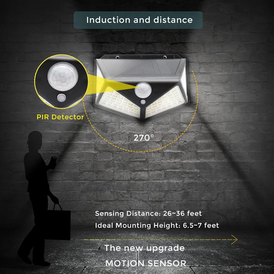 100 светодиодный/118 светодиодный Солнечный водонепроницаемый четырехсторонний индукционный настенный светильник для человеческого тела подходит для наружных коридоров, садовых ворот, террас на крыше, внутренних настенных вилл, витрин магазинов, магазинов, дома и другие наружные среды, без проводки, без электричества, изысканное мастерство и уникальный вкус.
