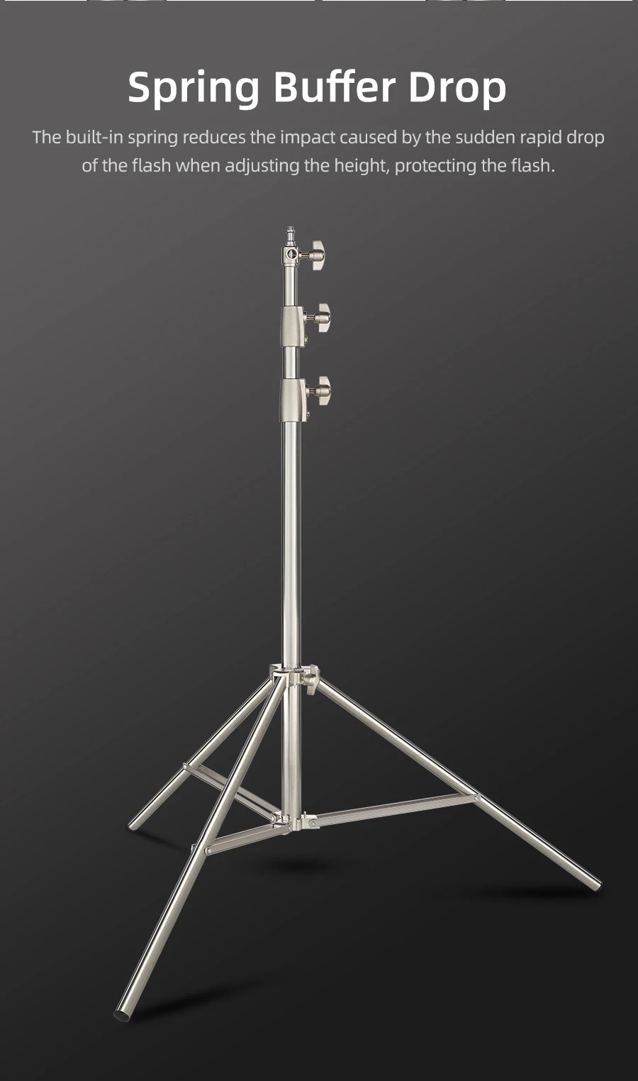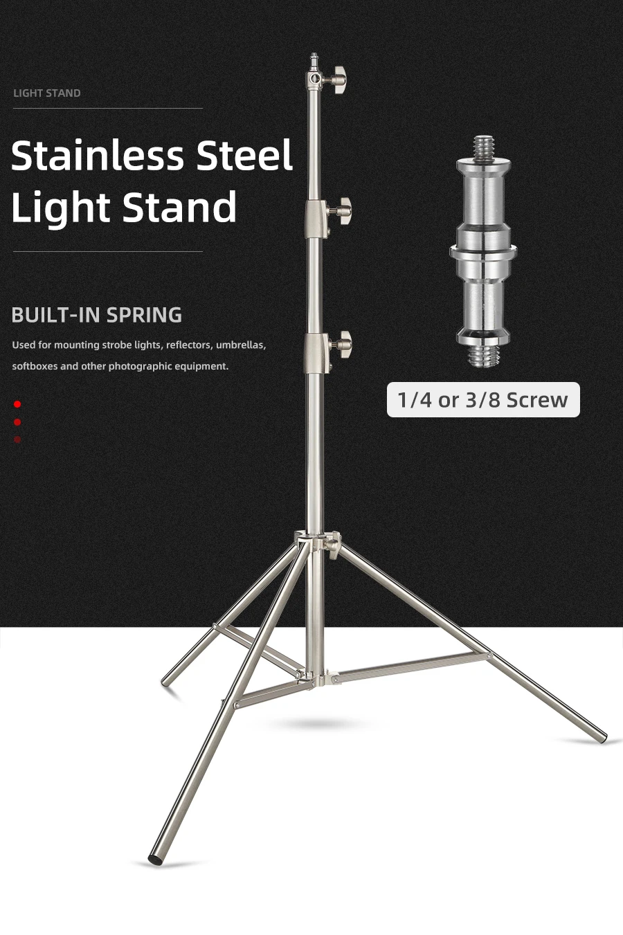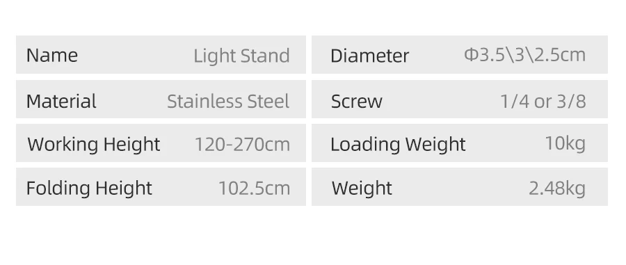 2.7M Stainless Steel Heavy Duty Light Stand for Studio Photo Video Flash Light Softbox Reflector for Professional PhotographyProduct descriptionStyle:Stainless SteelDescriptions:Used for mounting strobe lights, reflectors, umbrellas, softboxes and other photographic equipment.Made of solid metal, making it strong for heavy duty work.Its solid locking capabilities ensure the safety of your lighting equipment when in use.Specifications:Maximum Height: 270cm/8.8feetFolded Height: 102.5cm/3.3feetMaterial: Stainless SteelDiameter:2.5cm/3cm/3.5cmWeight:2.48kgPackage Content:1 x Light Stand