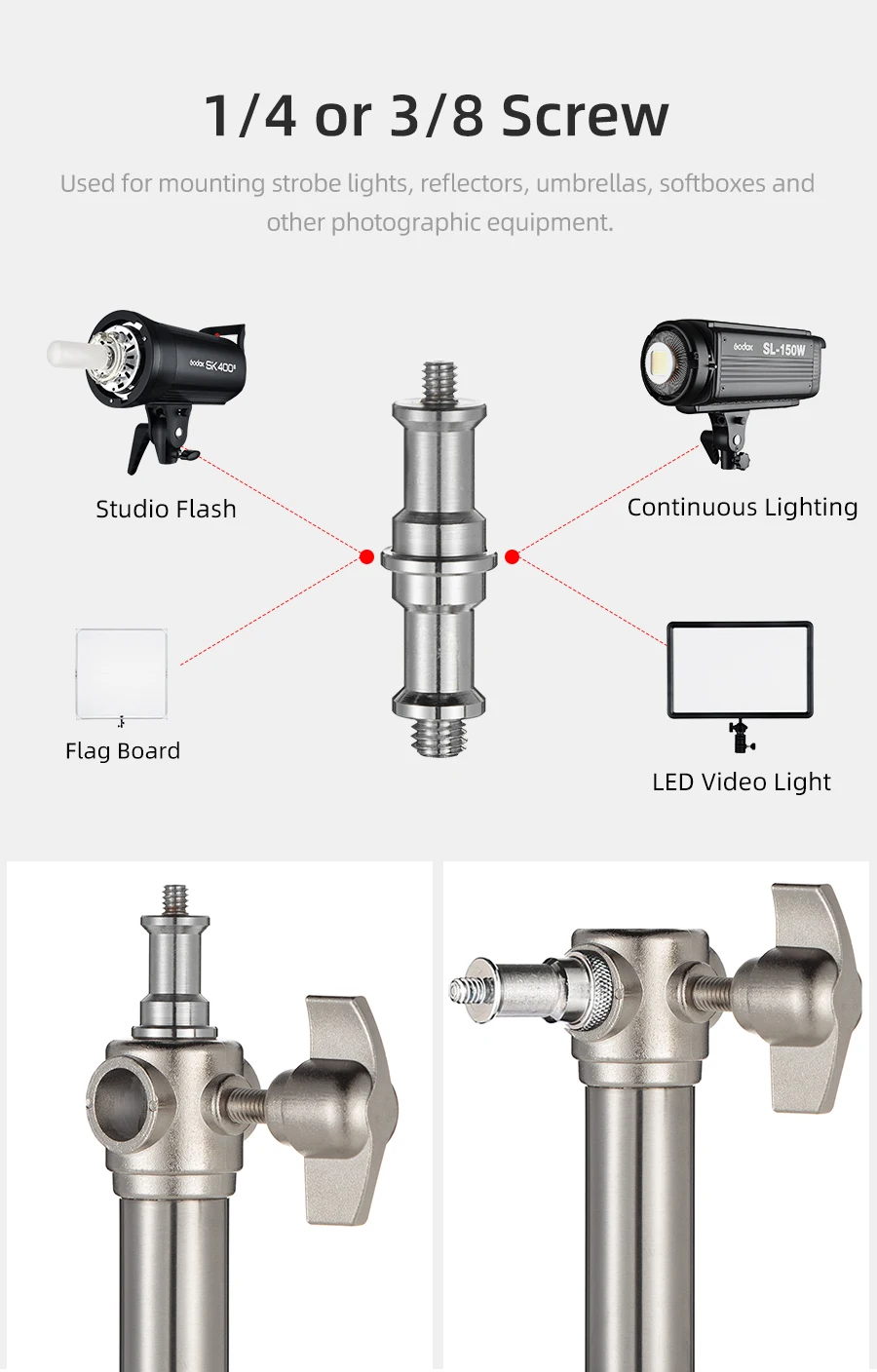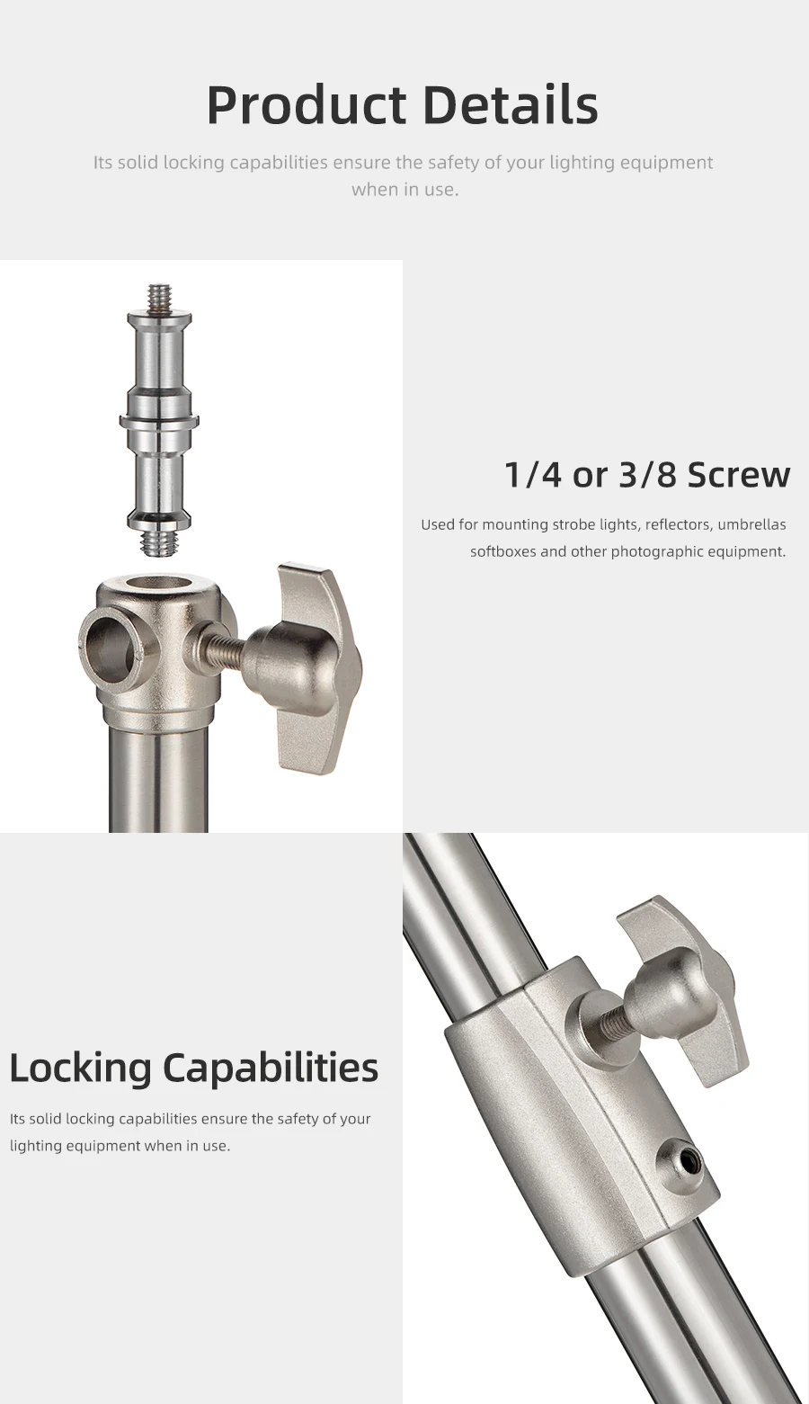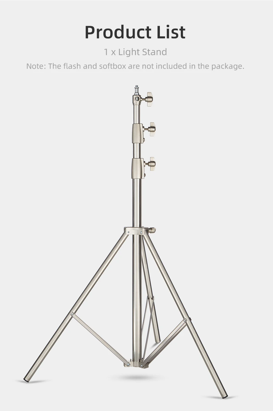 2.7M Stainless Steel Heavy Duty Light Stand for Studio Photo Video Flash Light Softbox Reflector for Professional PhotographyProduct descriptionStyle:Stainless SteelDescriptions:Used for mounting strobe lights, reflectors, umbrellas, softboxes and other photographic equipment.Made of solid metal, making it strong for heavy duty work.Its solid locking capabilities ensure the safety of your lighting equipment when in use.Specifications:Maximum Height: 270cm/8.8feetFolded Height: 102.5cm/3.3feetMaterial: Stainless SteelDiameter:2.5cm/3cm/3.5cmWeight:2.48kgPackage Content:1 x Light Stand