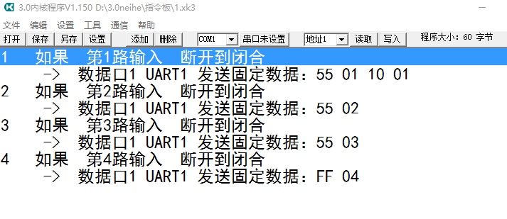 Этот продукт настроен на 3 ядра программирования и все китайские настройки программирования. Все команды выбираются с помощью опции.Пример 1. При входном действии (от разрыва до момента закрытия) порт данных 1 высылает фиксированные команды наружу. Содержание команды