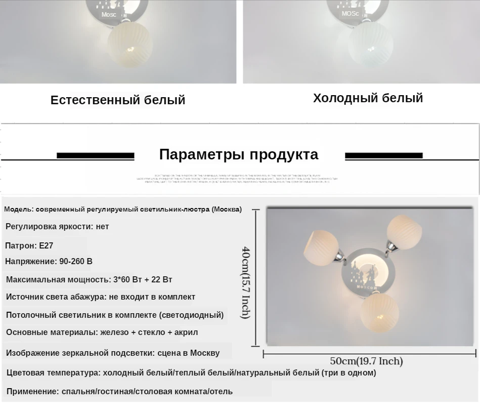 Модель: Современный регулируемый светильник-люстра Размер: 40 см * 50 см (15,7 дюйма * 19,7 дюйма) Патрон: E27 Напряжение: 220 V Максимальная мощность: 3*60 Вт + 22 Вт Материал абажура: матовое стекло Акриловый светильник с рисунком панели: Абажур светильник источник: не входит в комплект Потолочный светильник источник: в комплекте (светодиодный чип) Цвет Температура: Холодный/теплый/натуральный белый (три в одном) Уважаемый, эта люстра имеет холодную/теплую/естественную белую 3 цветовую температуру, вы можете включить/выключить люстра, чтобы изменить цвет.