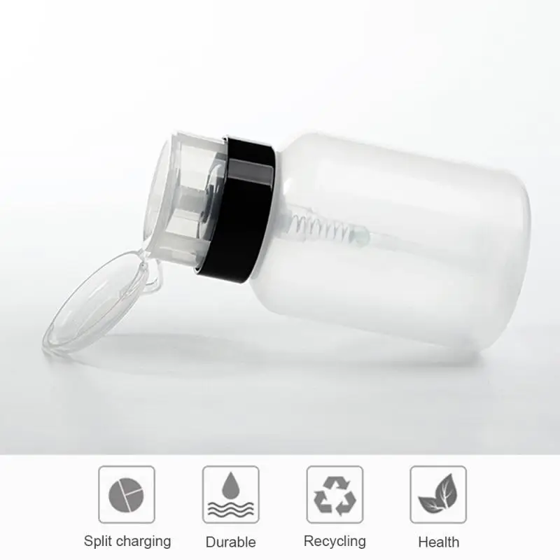 Изготовлен из пластика, который многоразовый, анти-растрескивающийся и Разлагаемый. Запираемая версия бутылки, позволяет избежать утечки жидкости. Этот дозатор насоса используется для дозирования жидкости из бутылки удобным, простым и очень удобным способом. Для ацетона/моющего средства/удаления лака/удаления макияжа и т. д. идеальные инструменты для лечения Ногтей и макияжа. Профессиональный инструмент для дизайна ногтей для ногтевого техника, портативная бутылка, легко переносится в любом месте.