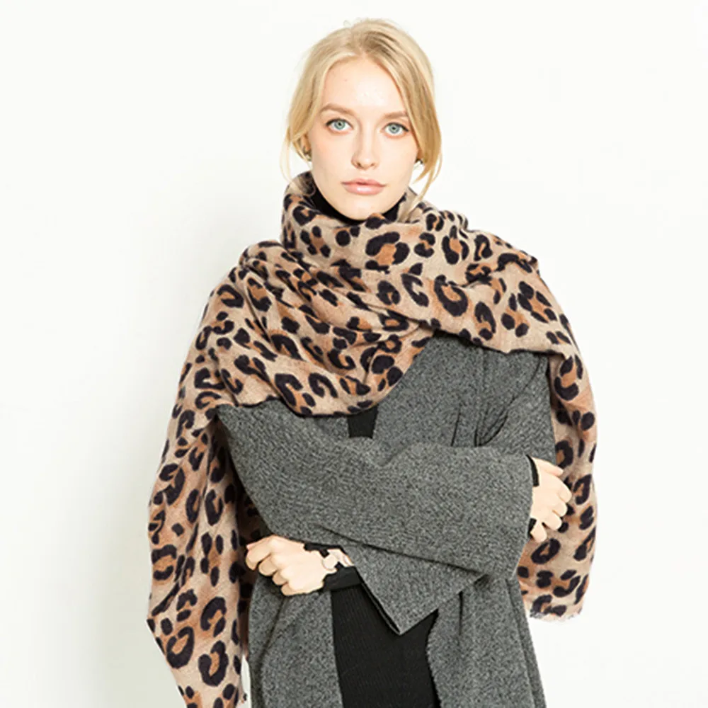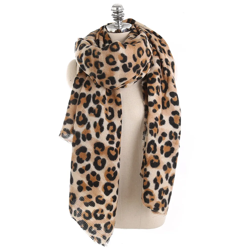 Женский зимний теплый длинный шерстяной шарф с леопардовым принтом, мягкий длинный шарф