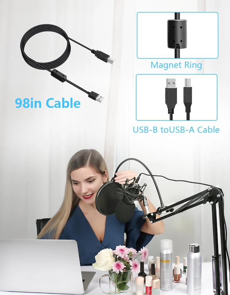 конденсаторный микрофон с поп-фильтром и поролоновым ветрозащитным экраном записывает ваш голос, а звук кристально чистый, амортизирующее крепление удерживает микрофон устойчиво с функцией демпфирования.