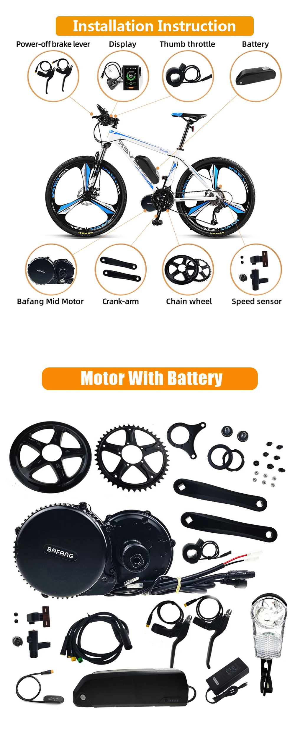 2. Батарея и мотор будут отправлены отдельно, и Вы получите 2 посылки, мы дадим вам 2 номера отслеживания тоже!3. В зависимости от страны и региона, батарея посылки будет задержать 7-15 дней, чтобы прибыть.# Советы:* Наш мотор в основном использует транспорт DHL, и некоторые страны используют транспорт DPD; Основной транспорт батареи UPS.* Если ваш регион находится в удаленном районе, мы будем взимать с вас определённую сумму сборов за удаленное обслуживание.* Если ваш адрес находится на остров, пожалуйста, свяжитесь с нами перед заказом, чтобы мы могли проверить, можем ли мы организовать доставку к вам.# Решения:* Вы можете оплатить почтовые расходы бесплатно, но сумма относительно большая, это дороже.* Есть ли у вас родные или друзья, живущие в дальнем городе? (Мы можем отправить его ему бесплатно, а затем попросить его отправить товар к вам. Это будет хороший выбор)Особенности:Это обновленный комплект конверсионного двигателя bafang, он включает датчик передач, он может помочь вам безопасно управлять велосипедом. Для ночного вождения, он также включает в себя 6 в светодиодные фары. Инструмент BBS-это хороший инструмент для установки двигателя Bafang. Все они-полезные аксессуары.С интегрированным датчиком скорости, этот двигатель среднего привода, который совместим с 68 мм нижним кронштейном, имеет номинальную мощность 500 Вт, коэффициент уменьшения 1: 21,9 и максимальный крутящий момент 80 Н. М, обеспечит всадника большой взрывной силой при запуске системы. Высокопрочный и эффективный, этот мотор значительно увеличивает радость езды и подходит для горных велосипедов и песочных велосипедов, которые являются любимыми гонщиками, которые любят проблемы, а также транспортные велосипеды.