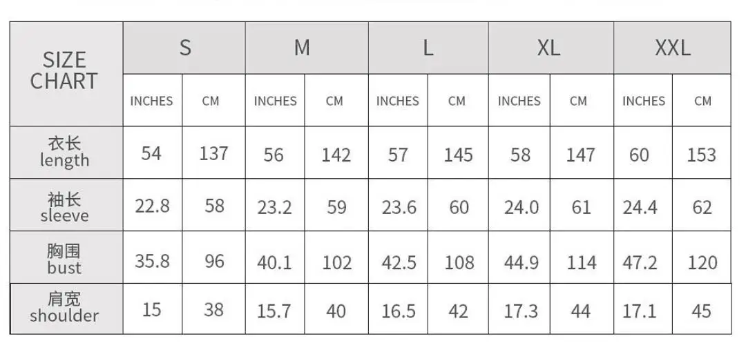 S: США Размер 14/12W, Дубай, размер 52, бюст 96 см рукав 58 см, Длина 137 см М: США Размеры 16/14 Вт, Дубай, Размеры 54, обхват груди 102 см, рукав 59 см, Длина 142 см L: размер США 16 Вт, размер Дубай, обхват груди 108 см, рукав 60 см, длина 145 см XL: размер США 16 Вт, размер Дубай, обхват груди 114 см, рукав 61 см, длина 147 см XXL: размер США 16 Вт, размер Дубай, обхват груди 120 см, рукав 62 см, длина 153 см