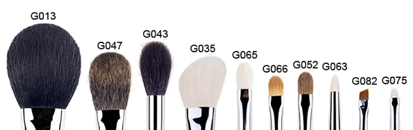 Эта серия кистей оснащена деревянной ручкой из черного дерева с медным наконечником, выглядит великолепно и роскошно. G013 кисть для пудры для лица, изготовленная из мягкого козьего волоса sokouhou, плоская кисть с полной округлой формой волос, для чистого нанесения свободного или прессованного порошка по всему лицу. Возьмите немного пудры с кончиками волос, аккуратно проведите щетку, чтобы нанести пудру на контуры лица. Размер: полная длина 207 мм; Длина волос 57 мм; Ширина волос 48 мм. G047 кисть для румян, изготовленная из мягких канадских волос белки, округлая плоская кисть, для затенения и подсветки щек румянами. Стандартная кисть для румян позволяет легко контролировать естественную окраску даже для начинающих макияжа. Размер: полная длина 181 мм; Длина волос 35 мм; Ширина волос 27 мм. G043 кисть для хайлайтера, изготовленная из мягкой козьей шерсти sokouhou, округленная купольная кисть для затенения и подсвечивания щек румянами. Он также может быть использован в качестве хайлайтера кисти, хорошо для рисования изящных градаций. Размер: полная длина 190 мм; Длина волос 35 мм; Ширина волос 18 мм. G035 контурная кисть, изготовленная из мягкой козьей шерсти sokouhou, угловая кисть для экспертного нанесения контура щек. Волокна образуют полированную кромку и мягкие и прочные в комплекте. Возьмите контурный порошок с кончиками волос и аккуратно нанесите его под скулы. Размер: полная длина 177 мм; Длина волос 20-32 мм; Ширина волос 29 мм. G065 кисть для теней для век, изготовленная из мягкой козьей шерсти sokouhou. Кисть овальной формы для затенения или смешивания порошкообразных или кремовых продуктов. Мягкие и гладкие волосы помогают равномерно наносить тени на лицо. Размер: полная длина 172 мм; Длина волос 16 мм; Ширина волос 10 мм. G066 кисть для консилера, изготовленная из синтетического волокна. Эта плоская кисть имеет мягкие синтетические волокна для нанесения кремовых теней. Можно также использовать для нанесения консилера на области вашего лица, которые вы хотите замаскировать, например, темные круги под глазами и прыщи. Размер: полная длина 164 мм; Длина волос 10 мм; Ширина волос 8 мм. G052 кисть для теней для век, изготовленная из упругих волос. Мягкая и гладкая кисть с закругленным краем для затенения или смешивания теней для век. Возьмите тени для век с кончиками волос, нанесите их на крышки и Смешайте. Размер: полная длина 166 мм; Длина волос 12 мм; Ширина волос 9 мм. G063 кисть для теней для век, изготовленная из мягкой козьей шерсти sokouhou. Эта остроконечная кисть в форме карандаша отлично подходит для точного затенения и смешивания на крышке. Вы можете использовать эту кисть, чтобы подчеркнуть внутренний угол глаза, или разобраться с деталями внешнего угла глаза. Размер: полная длина 164 мм; Длина волос 10 мм; Ширина волос 6 мм. G082 кисть для бровей, изготовленная из синтетического волокна, более Жесткая Щетина позволяет легко выровнять брови. Эта кисть имеет Угловые тонкие наконечники, хорошо подходит для создания более точных линий. Вы можете использовать эту кисть для нанесения цвета на брови или для определения или заполнения бровей. Размер: вся длина 154 мм; Длина волос 7 мм; Ширина волос 6 мм. G075 кисть для теней для век, изготовленная из мягкой козьей шерсти sokouhou. Эта маленькая кисть имеет закругленный край с гладкими, твердыми, мягкими волокнами для точного затенения на крышке. Он 