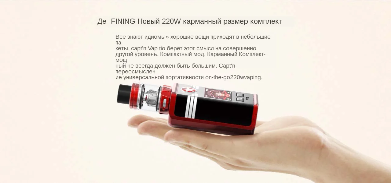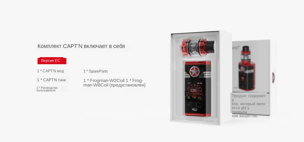 ТИП: НАБОР CAPT'N KIT Размер мода: 75*33*42 мм Размер бака: 24,5*51 мм Аккумулятор: внешний 2*18650 Диапазон сопротивления: 0,15-3,0 Ом Режим работы: VW/TC/Smart/CCW/CCT/Bypass Экран дисплея: 1,3-дюймовый цветной TFT Совместимость/разъем: 510 Выходная мощность: 10-220 Вт Рекомендуемая мощность: 50-100 Вт