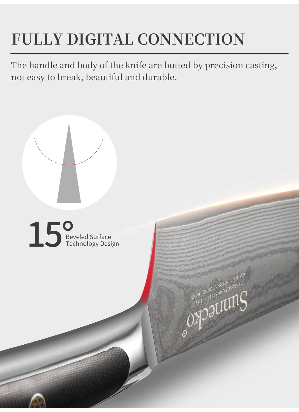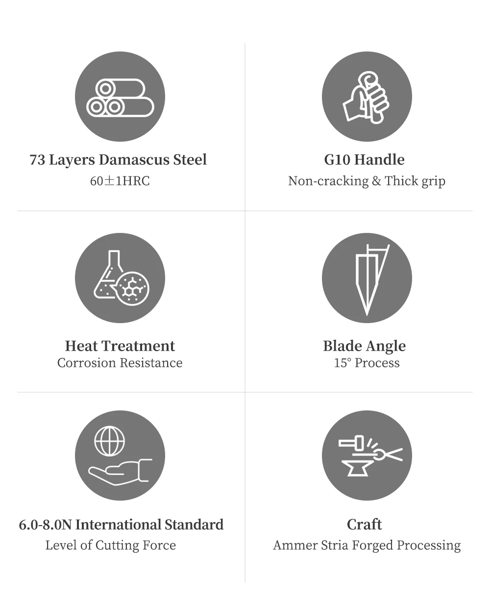Weight: 314gBlade Length:7"/17.8cmKnife Length:11.75"/29.9cmThickness:2.2mmBlade Material: Imported Japanese VG10 Super Steel with 73-layer High Damascus Steel