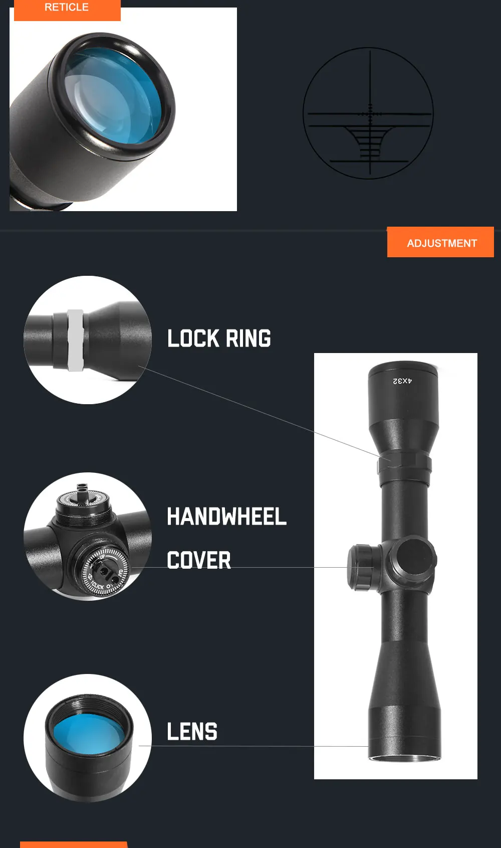 Увеличение: 4X Диаметр объектива: 32 мм/1,26 дюйма Поле зрения: 100 ярдов 33,7 дюймов Выход выходного зрачка: 94 мм/3,7 дюйм (ов) Диаметр трубы: 25,4 мм Особенности: Этот вид простого телескопа хорош для начинающих и продвинутых стрелков, чтобы снимать цель, и он точно нацелен на 300 метров Алюминиевый сплав, прочный и износостойкий Высококачественный объектив с оптическим покрытием, имеет кристально чистый вид Подходит для 20 мм рельсов телескопов В комплект входят два направляющих и гаечный ключ для быстрого и надежного крепления к любым рельсам Пикатинни или Вивера