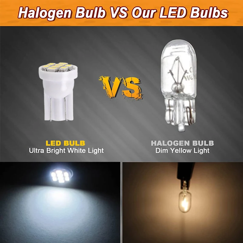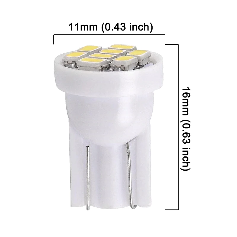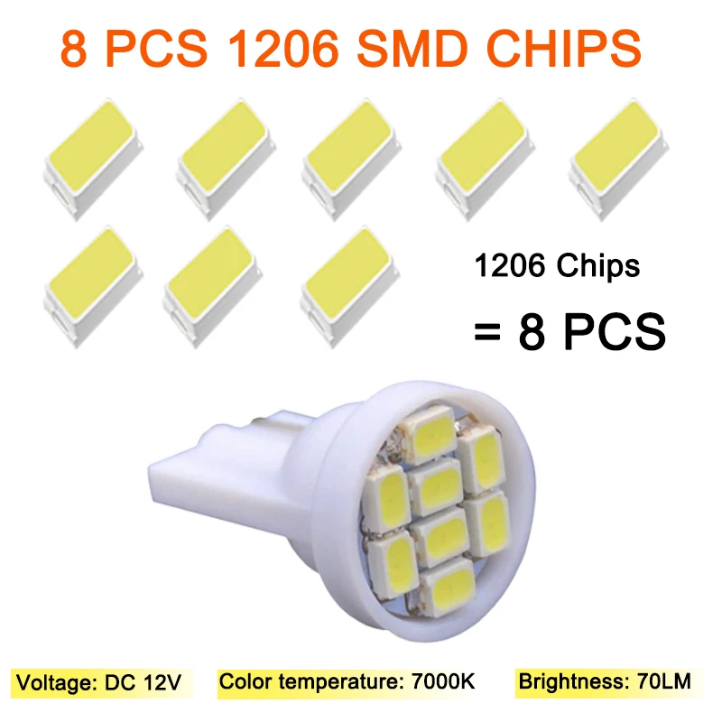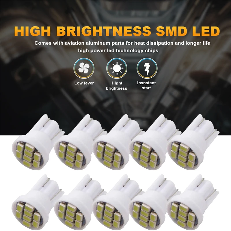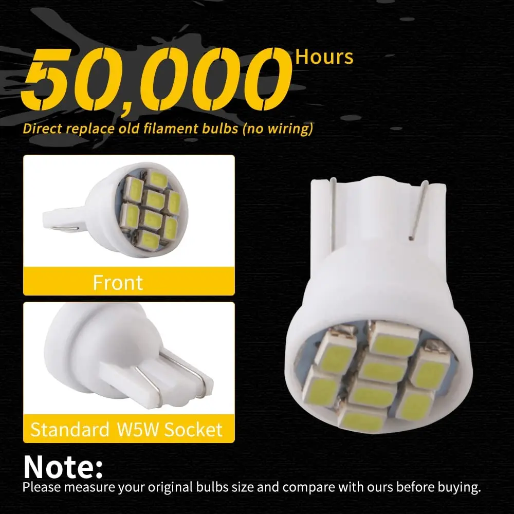 Voltage: 12VLED Color: White 7000KLED Type: T10 3020(1206) SMD, each LED has 8 SMD in total.Base Diameter: 12mmTotal Height: 16mmHigh efficient lighting: Compared with Original halogen lamp,Our Ultra Bright Astigmatism LED Bulbs give you a better lighting experience,can light up every corner.Ultra Bright LED, unique and more vivid color. Cross Reference:Direct replacement for all T10 Wedge Type W5W, 147, 152, 158, 159, 161, 168, 184, 192, 193, 194 2825. Application: Used as Interior Map Lights, or Dome Lights, or License plate light, or Parking Lights, or Corner Lights, or trunk light, or Side Marker Lights, or Side Door Courtesy, or Cargo light, or Trunk lights etc. It depends on the vehicle. Besides, Please double check owners manual or original bulb size to confirm Note:Before purchase it, please make sure your bulbs is T10 Wedge Socket.Because the LED bulbs have lower power consumption, German brand name of cars may need to tap on Load Resistors to remove the error code on dashboard, to remove error message, please choose T10 canbus bulbs.If they don't light after inserting into the socket, insert oppositely. Package included:10 PCS LED Bulb ![]()