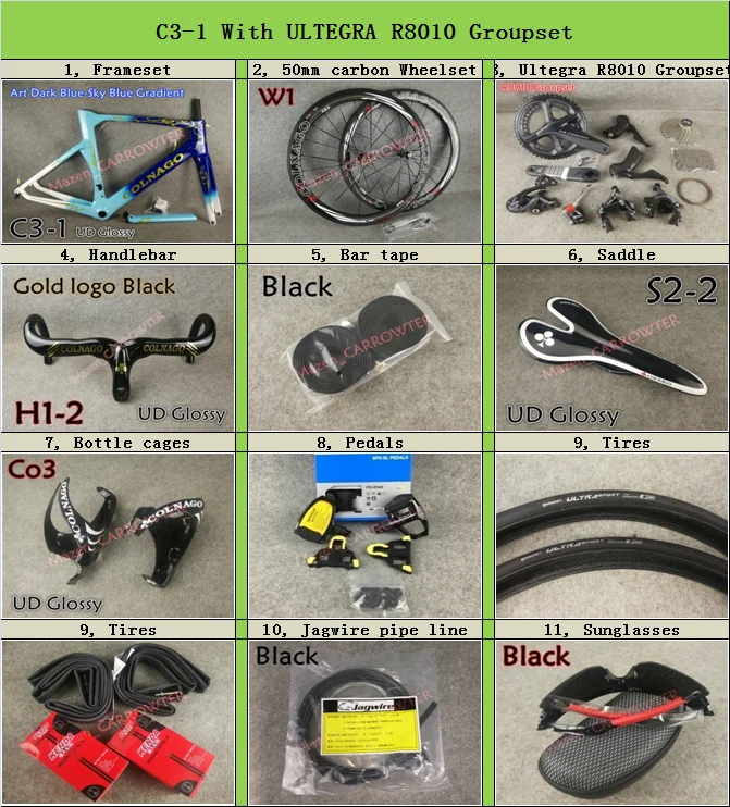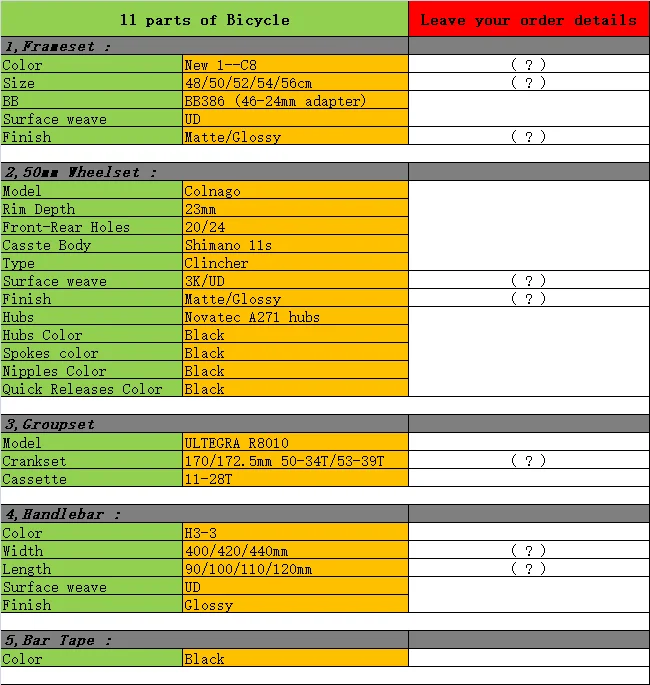 Такие как: 1, комплект рам. 1> Модель: Новинка 1-C8 (Выберите один) 2> Размер: XXS/XS/S/M/L/XL (Выберите один) 3> плетение: UD 4> Отделка: глянцевая/матовая (Выберите один) 5>BB: BB386 2, Углеродные колеса 1> Модель: 50 мм 2> переплетение поверхности: UD/3K (Выберите один) 3> Тип: клинчер 4> Отделка: матовая/глянцевая (Выберите один) 5> передние/задние: 20/24 часа в сутки 6> ширина тормозной дорожки: 23 мм 7> ступицы: Novatec A271 хаб 8> Цвет ступицы: черный 9> Цвет спиц: черный 10> Цвет сосков: черный 11> Быстрый выпуск Цвет: черный 12>Casste body: $ himan0 11s 3, Groupset --- какой из них вам нужен? 1> Тип: R8010 2> кассеты: 11-28T 3> Размер кривошипа: 170/172.5 мм (Выберите один) 4> коленчатый набор: 50-34T/53-39T (Выберите один) 4, углеродный руль для шоссейного велосипеда 1> Модель: H1-2--H9 (Выберите один) 2> переплетение: UD/3K (Выберите один) 3> Отделка: глянцевая/матовая (Выберите один) 4> Ширина: 400/420/440 мм (по выбору) 5> Длина: 90/100/110/120 мм (по выбору) 5, повязка на руль 1> Цвет: черный 6, седло дорожного велосипеда 1> Модель: S1-1--S4 (Выберите один) 2> переплетение: UD/3K (Выберите один) 3> Отделка: глянцевая/матовая (Выберите один) 7, 1 пара бутылок для воды 1> Модель: Co1 -- Co10 (Выберите один) 2> переплетение: UD/3K (Выберите один) 3> Отделка: глянцевая/матовая (Выберите один) 8, PD-R540 педали 9, шины (какой цвет?) 1> Цвет: черный/красный/синий (Выберите один) 10, Jagwire линия трубы 1> Цвет: черный 11, солнцезащитные очки 1> Цвет: черный
