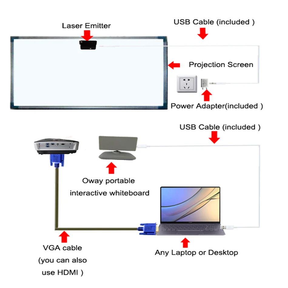 Просто установите лазерный излучатель в средней области над белой доской (или плоской поверхностью) и поместите приемник сигнала на проектор.